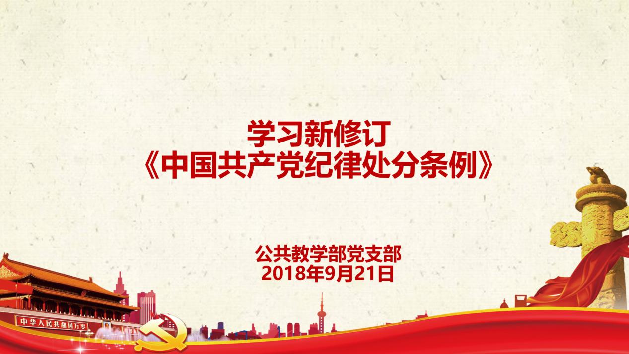 2018年8月18日,中共中央印发修订后的《中国共产党纪律处分条例》(以下简称《条例》)。为落实党中央精神,根据校党委、纪检委安排,公共教学部党支部组织广大党员教师学习贯彻《条例》。