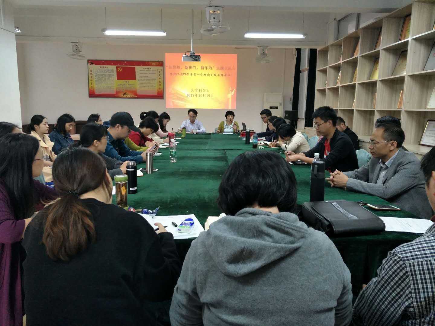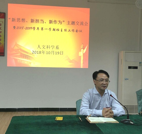 为深入学习贯彻习近平新时代中国特色社会主义思想和党的十九大精神,贯彻全国教育大会精神,把立德树人作为根本任务,进一步推动我系"三全育人"工作的开展,10月19日下午,人文科学系召开"新思想、新担当、新作为"主题交流会暨2018-2019学年第一学期班主任工作会议。会议由系党总支副书记周海林主持,校党委副书记、纪委书记莅临指导,人文科学系全体班主任与教工党员参加会议。