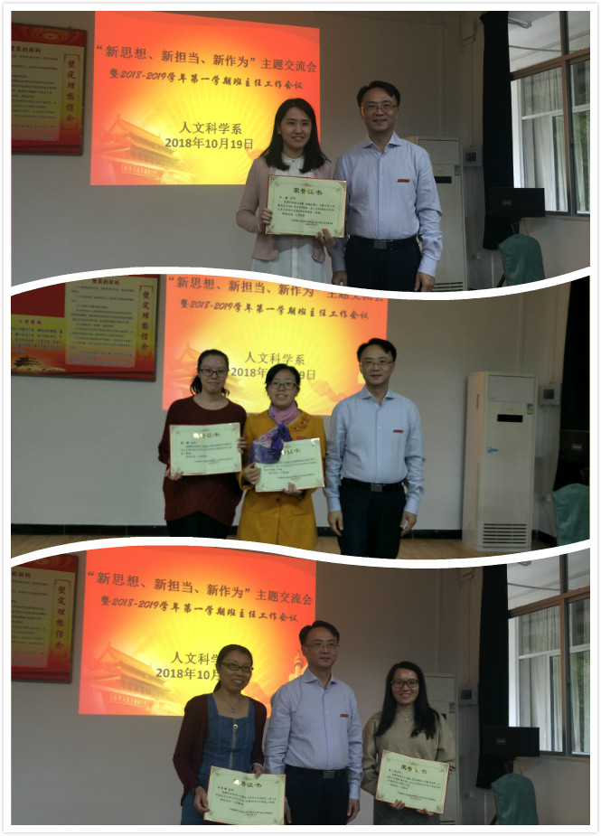 会议还公布了人文科学系2018年大学生导师工作案例的评比结果,书记亲自为获奖的教师颁发证书。