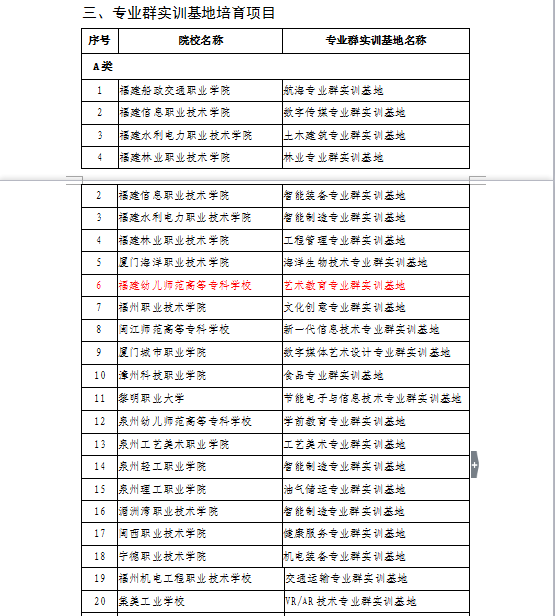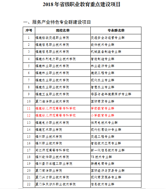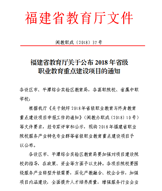 2018年10月11日,《福建省教育厅关于公布2018年省级职业教育重点建设项目的通知》下达,艺术系艺术教育专业群实训基地培育项目成功入选2018年省级职业教育重点建设项目。这是继2017年我系艺术教育专业群入选省级服务产业专业群之后,我系取得的又一专业建设成果。