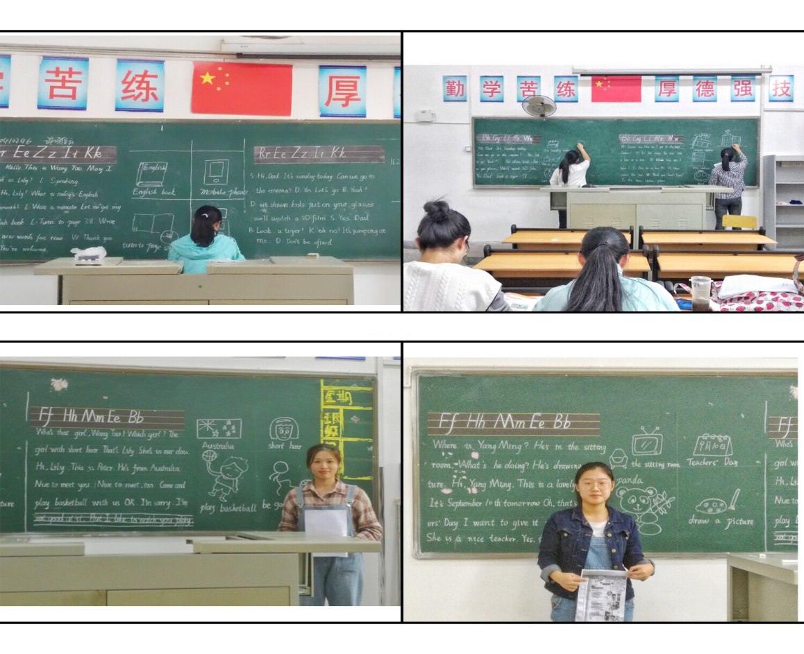 根据实习带队老师和小学一线教师的反馈,外语系对2018年英语教育专业师范生技能考核内容做出调整,对标岗位,突出"活用"。学生首先进行闽教版小学英语课本(高年级)课文任意抽读,后将抽签确定的课文板书于黑板,并根据课文重难点设计简笔画,从而实现校内实训与实习岗位要求的无缝对接。