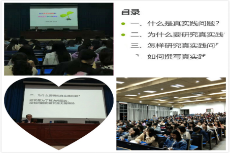 叶老师先以同学们论文写作中常见的问题为引子,重点给同学们介绍了什么是真实践问题,为什么要研究真实践问题,怎样研究真实践问题,如何撰写真实践等问题。在此基础上,叶老师借助"儿童歌唱走音问题的行动研究"的科研案例,重申论文写作的基本格式,提出了"研究是为解决问题"" 没有问题的研究是无病呻吟"等务实的科研理念,并强调务必使论文撰写的过程成为自己教育教学实践的一部分,努力在行动中研究,在研究中积累心得,保持终身学习的热情,做反思型的研究者。