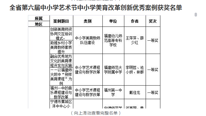 近日,福建省教育厅公布了《福建省教育厅关于公布全省第六届中小学生艺术节优秀组织奖及各项目获奖名单的通知》(闽教体〔2018〕30号),艺术系王萍萍教授、校培训中心薛少红主任合作的案例《创新美育师资协同交互培训模式,助推乡村小学美育教师素质提升》荣获全省第六届中小学艺术节中小学美育改革创新优秀案例一等奖,并入围选送教育部,参加全国第六届中小学艺术节中小学美育改革创新案例评选。