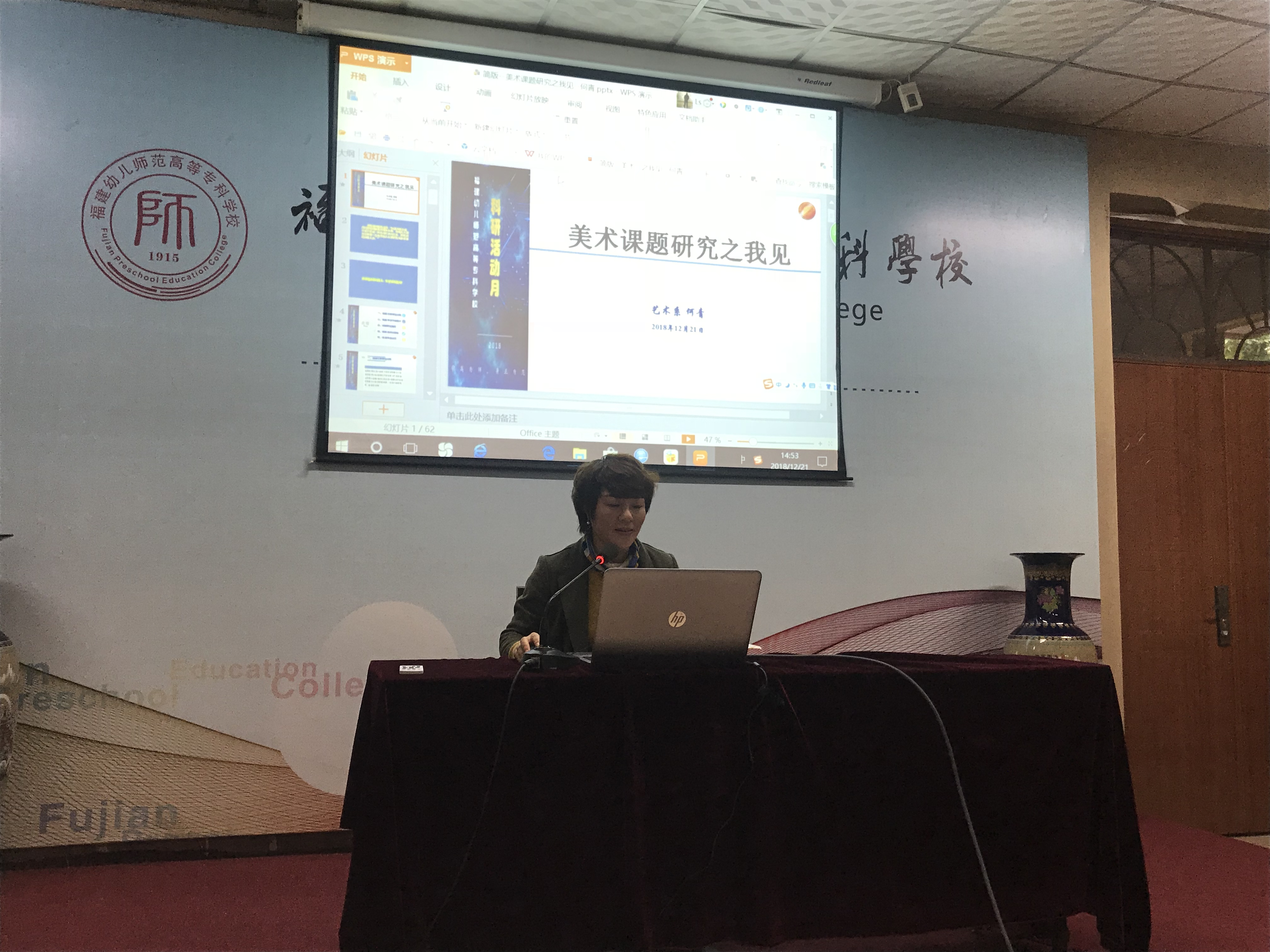 2018年12月21日下午,由艺术系主办的"艺术教育论文写作指导及课题研究讲座"在学校校部行政楼101会议室成功举行。艺术系领导及全系教师共同参加讲座活动。