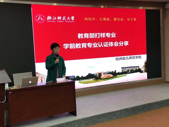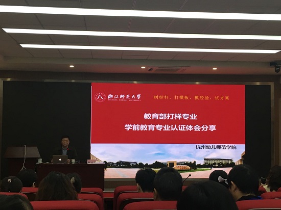 赵院长结合杭州幼儿师范学院学前教育专业认证工作开展的实际情况,分享了本院学前教育专业通过教育部师范类"打样任务"专业认证的做法和经验,他从认证理念理解、自评报告撰写、佐证材料制作、专家进校考查四个方面对专业认证工作进行逐一讲解,详细介绍了杭州幼师学前教育专业认证工作各环节中的诸多要点,讲解深入浅出,对我系开展认证工作具有很强的指导性和借鉴作用。