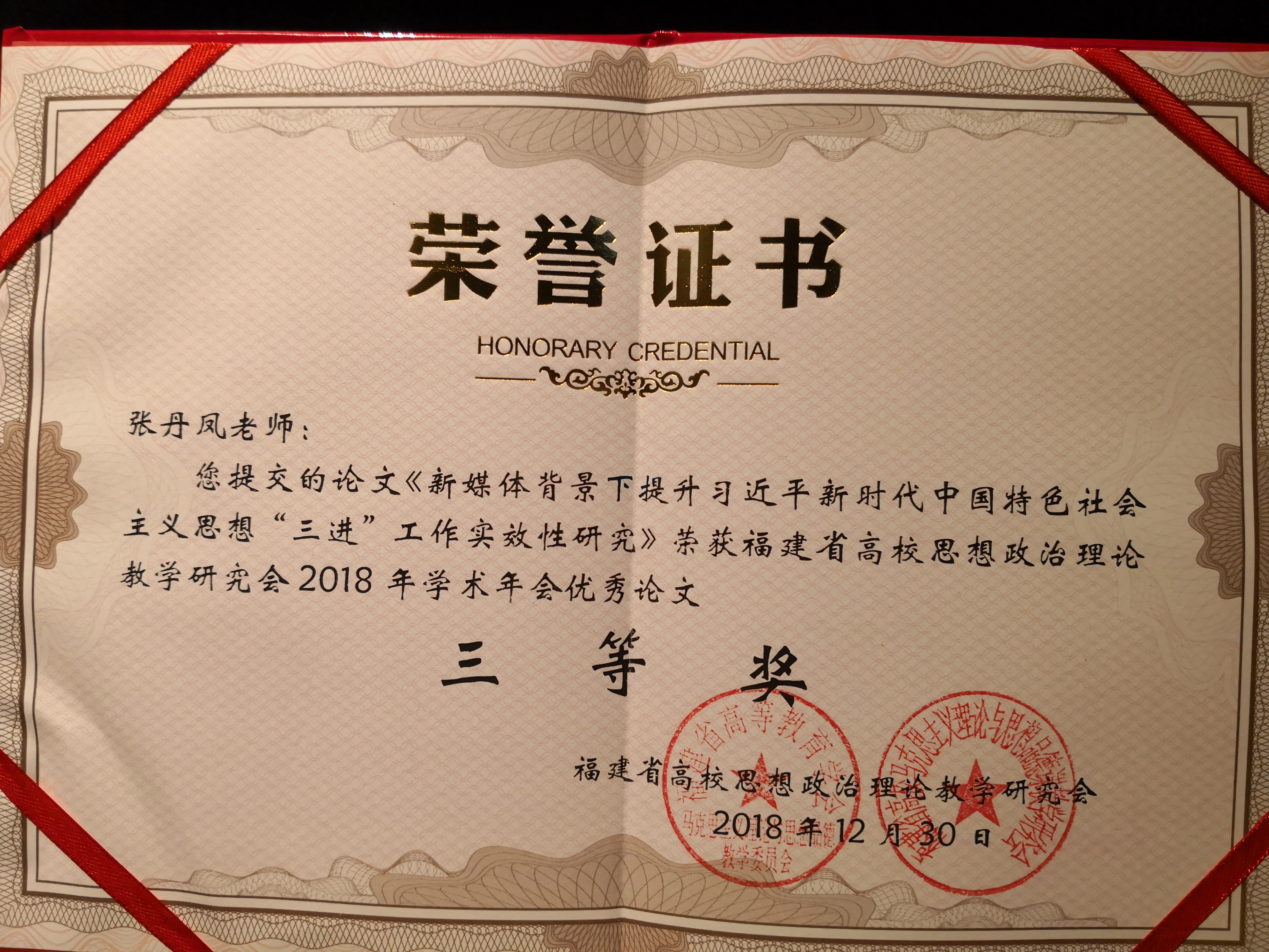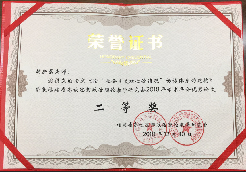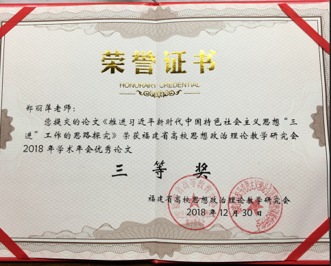 2018年12月28-30日,福建省高校思想政治理论教学研究会2018年度学术年会召开。我校马克思主义学院伊文婷院长和郑舒丹老师参加了此次年会。在研究会年度优秀论文评选中,我校马克思主义学院教师喜获丰收。