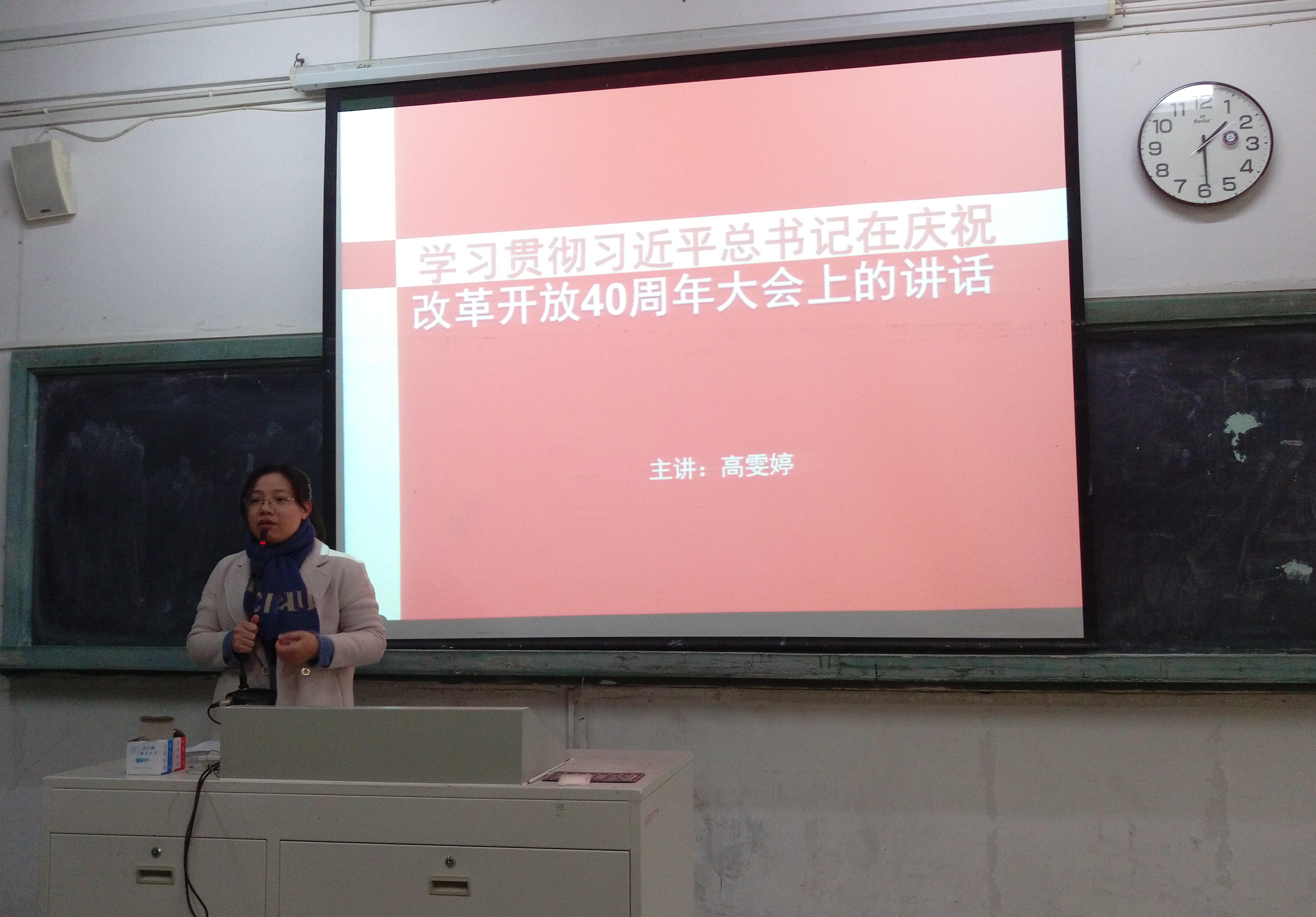 此次读书活动由马克思主义学院高雯婷老师主讲,主题为《学习贯彻习近平总书记在庆祝改革开放40周年大会上的讲话》,高雯婷老师主要是从"讲话原文与金句要点"及"习近平的改革足迹——福建"这两个方面展开讲解。同时表示作为"习近平新时代中国特色社会主义思想"读书社成员要深入学习贯彻习近平总书记重要讲话精神,带头学习宣传,带头贯彻落实,切实把思想和行动统一到重要讲话精神上来,要用心领会、用情感悟、用力落实,履职尽责,担当作为,勇当新时代改革开放的排头兵,创造无愧于新时代要求的新业绩。