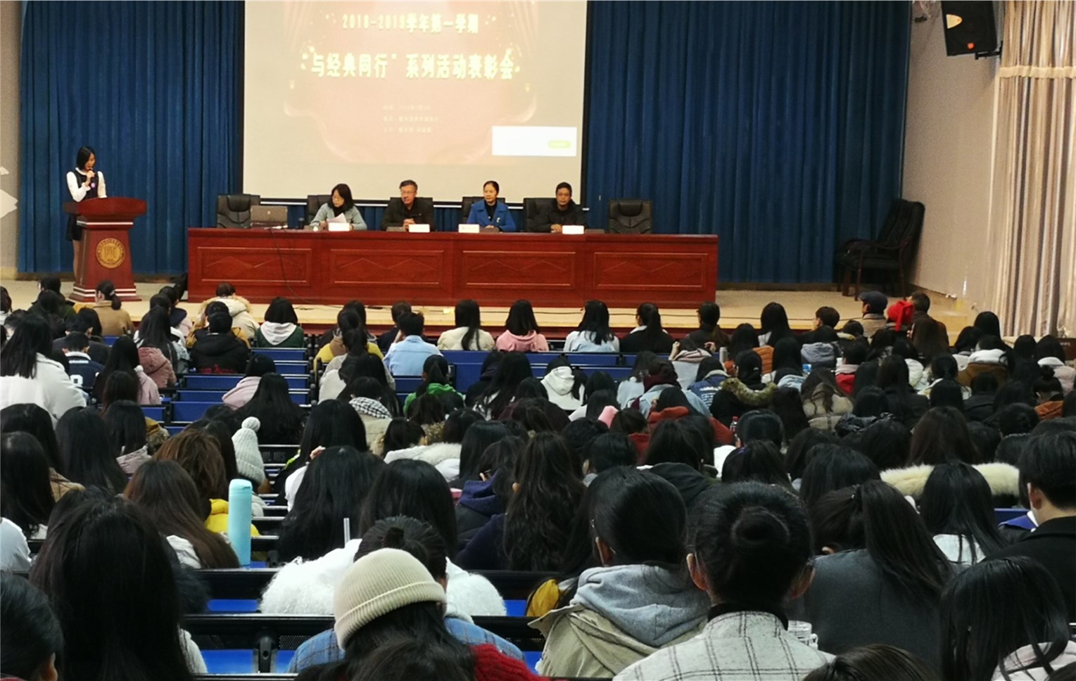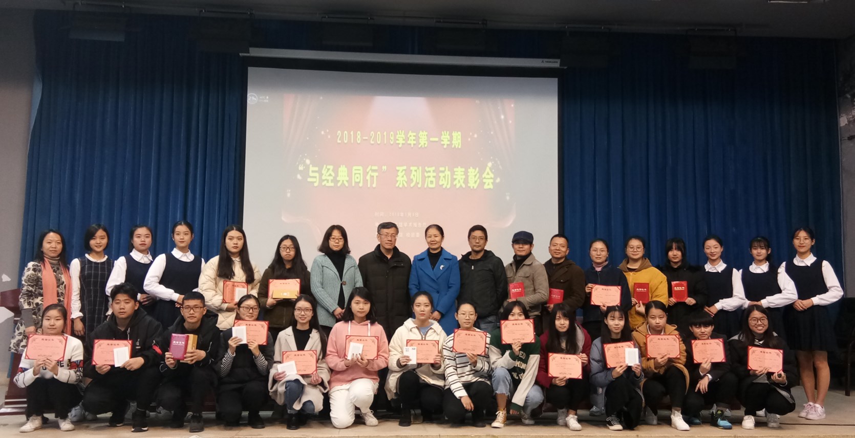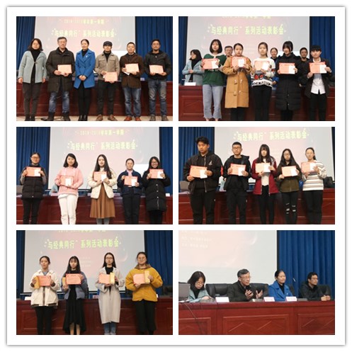1月9日中午,图书馆在学术报告厅举行2018-2019学年第一学期"与经典同行"系列活动表彰会。对在"悦读经典 乐享精彩"好书推荐比赛中获奖的学生以及"教师荐书积极分子"、"学生借阅之星"、"悦读"书友会积极分子、阅读推广活动积极分子进行表彰。图书馆胥文玲馆长、公共教学部郑伟副主任、艺术系陈青副主任、校团委王蔷老师应邀担任颁奖嘉宾, 获奖师生及各系学生代表300余名到场参加。