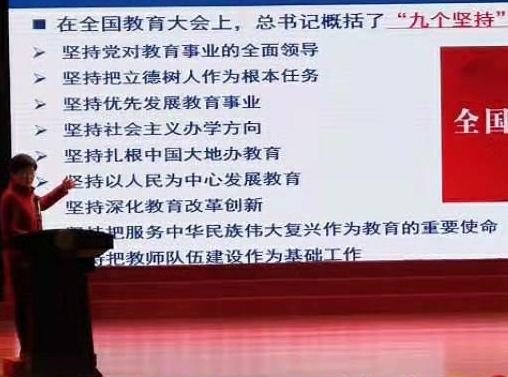陈峰校长从十八届四中全会提出全面依法治国,建设中国特色社会主义法治体系的大背景入手,全面剖析了教育法律法规的形式和效力,并结合学校的跨越发展和自己的教育工作实际,指出依法治校办学理念和依法执教的重要性。她还为同学们重点讲述了习近平总书记在全国教育大会上的"九个坚持"精神。