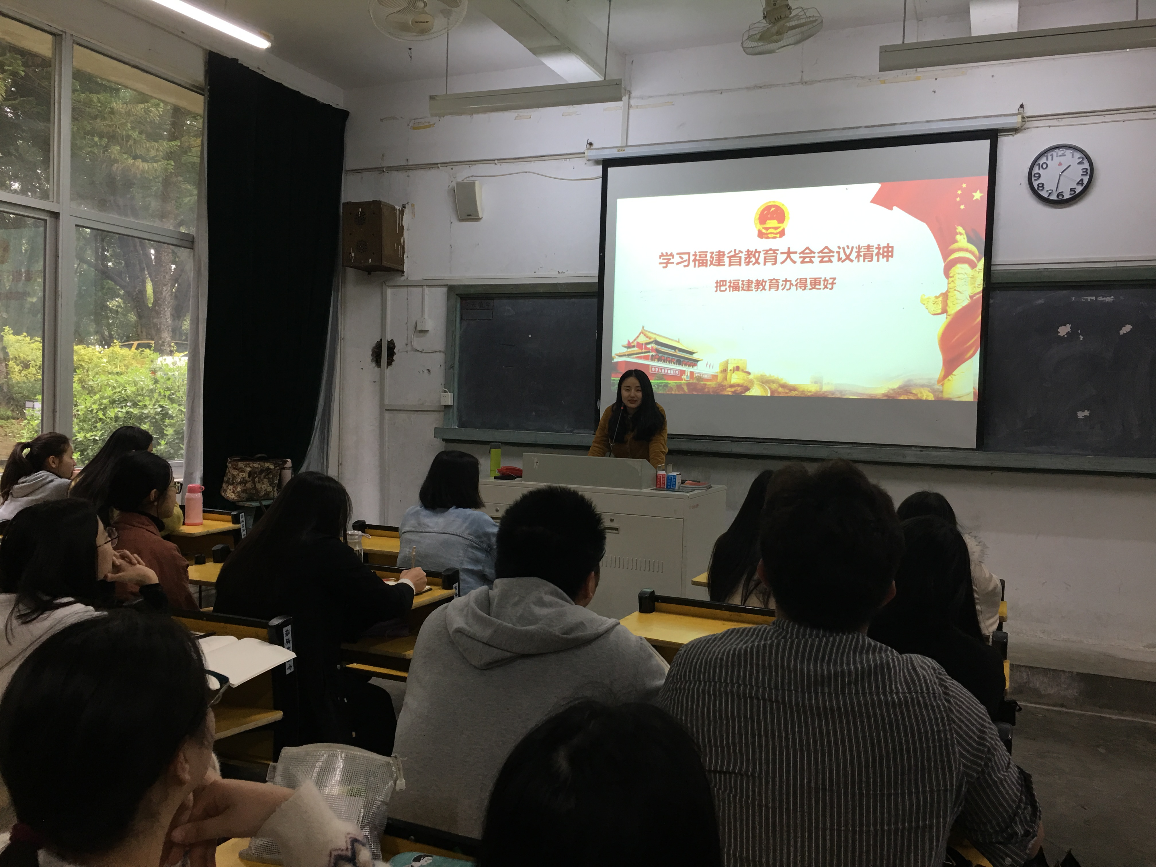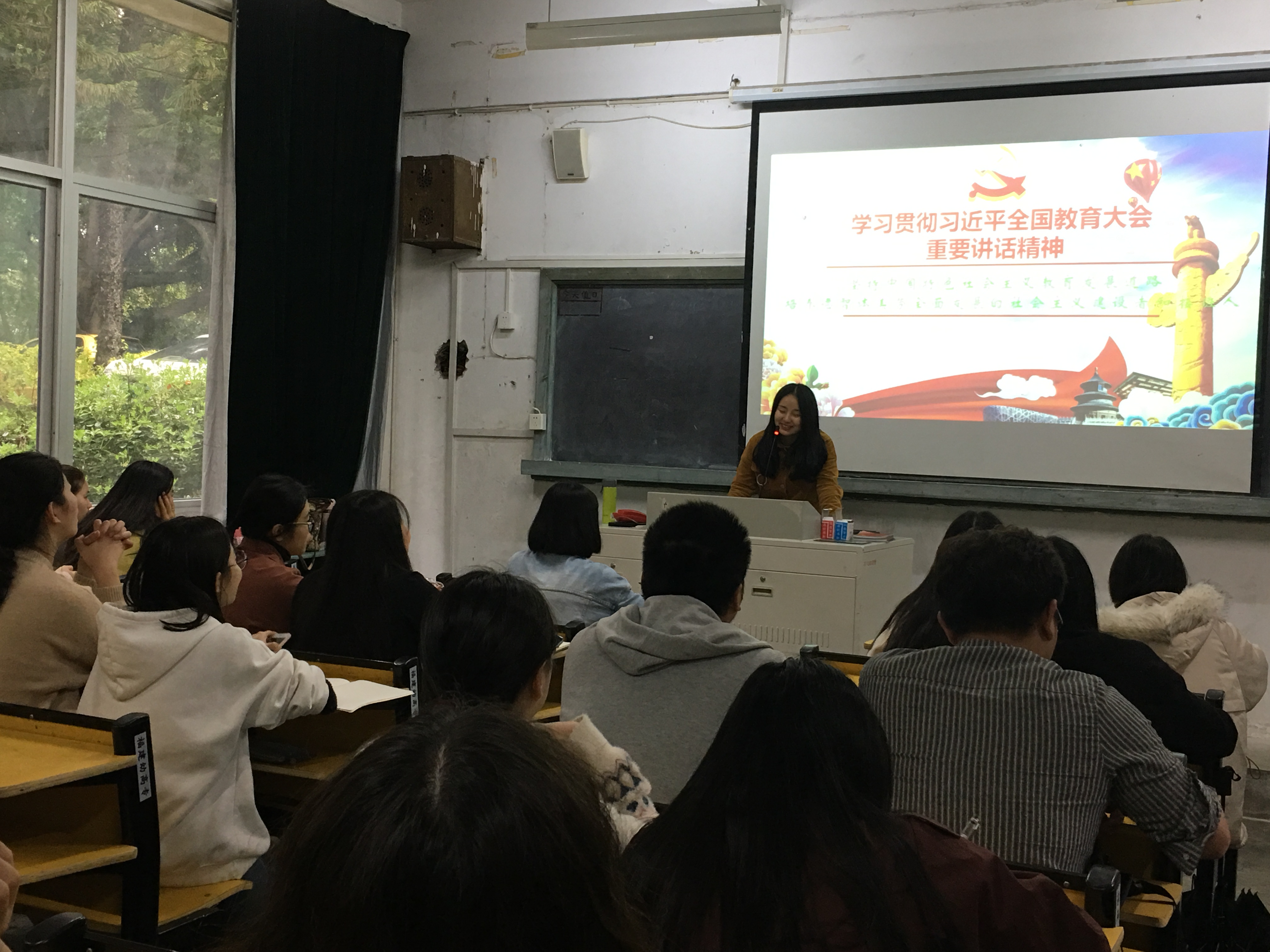 此次读书活动由马克思主义学院胡新蕾老师主讲,主题为《学习贯彻全国全省教育大会重要讲话精神》,新蕾老师从新形势下党的教育方针、教育事业的当代意义、十八大以来的教育成就及新时代教育的发展等十三个方面展开讲解并提炼关键词加以强调,并且带领我们学习了全省教育大会精神,让我们深入学习了"挺"教育就是"挺"未来、"挺"发展、"挺"民生的重要意义。