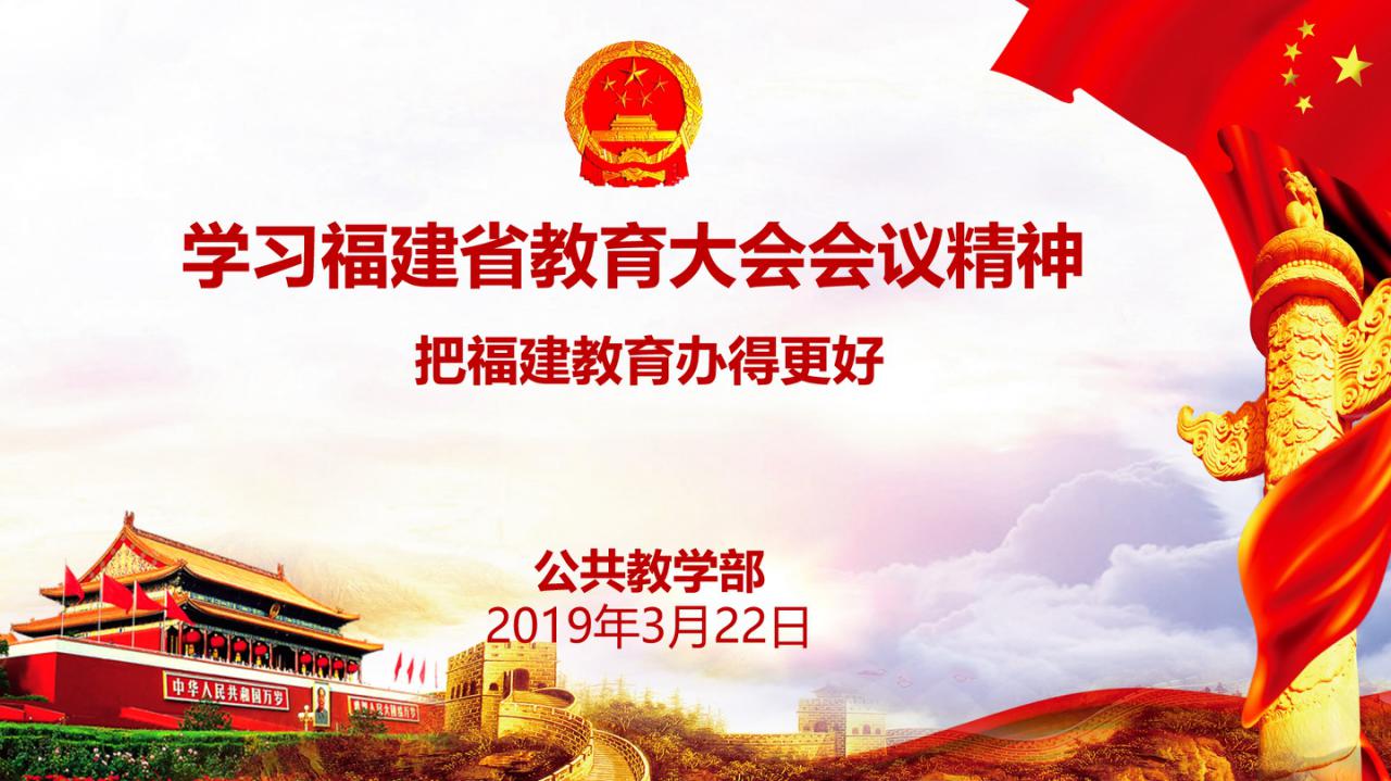 2019年2月22日,全省教育大会在福州召开。为深入学习宣传贯彻全省教育大会精神,全面落实立德树人根本任务,根据中共福建省委教育工委、省教育厅印发的《关于认真学习宣传贯彻全省教育大会精神的通知》及校党委通知要求,3月22日,公共教学部党支部组织全体教师开展"全省教育大会精神"主题学习活动。本次主题学习活动由支部书记张航主持,公共教学部全体教师参加学习活动。