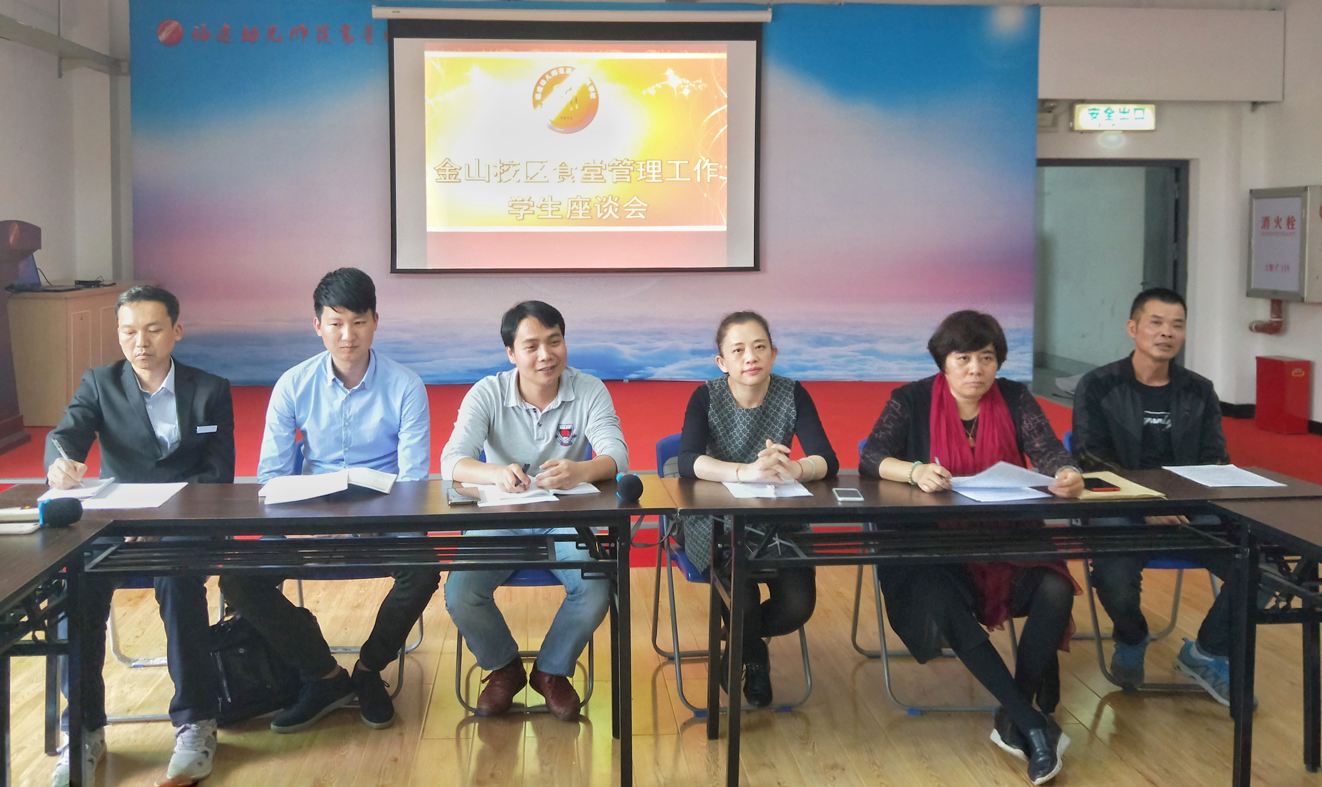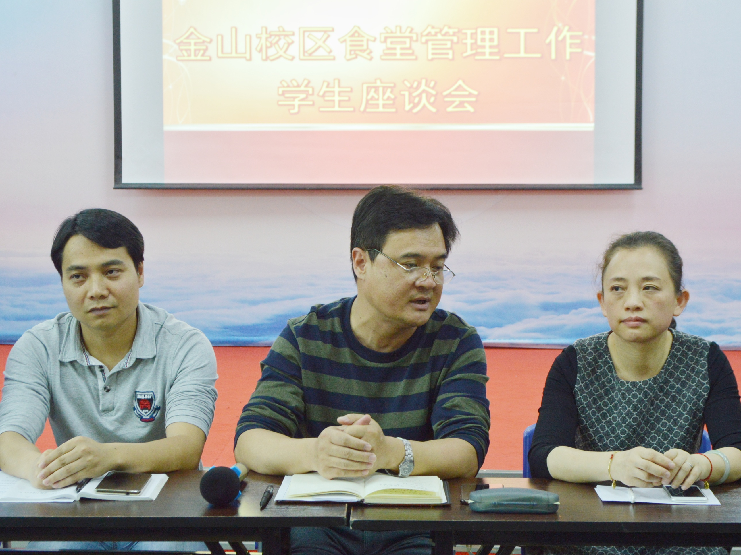 为了促进金山校区食堂的管理工作和食品安全监督能力,确保校园食品安全。2019年4月19日下午3点整,金山校区于学生活动中心举行了"金山校区食堂管理工作"学生座谈会。莅临本次座谈会的领导嘉宾有:校学工部姜琪副部长、金山校区管委会余深焰副主任、后勤管理处校膳食科王燕琴科长、外语系党总支林祥昊书记、胡华荣副书记、食惠餐饮杨逍总监、张卫国经理以及部分学生代表。座谈会由胡华荣副书记主持。