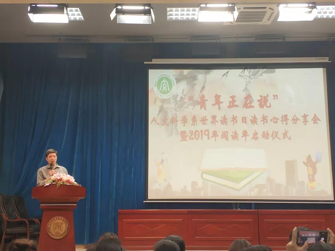 2019年4月23日世界读书日,"青年正在说"——人文科学系读书分享会暨2019阅读年启动仪式于图书馆报告厅举行。系党总支书记林琳、系副主任姜平、系党总支副书记周海林、系部各教研室主任、全体辅导员以及2017级、2018级的同学们参加了此次活动。