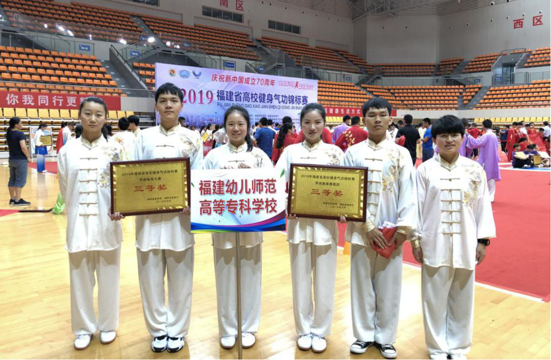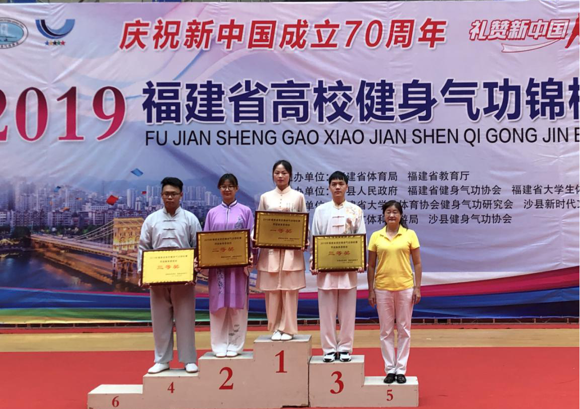 5月24日至5月27日,由福建省体育局办公室、福建省教育厅办公室共同举办的2019年福建省高校健身气功锦标赛在三明市沙县体育馆隆重举行,来自全省四十多所高校代表队参加了此次比赛。我校派出了以公共教学部王奕主任为领队,李洪星、卓存杭为教练以及来自人文科学系的6位同学组成的代表队参加了丙组的比赛。
