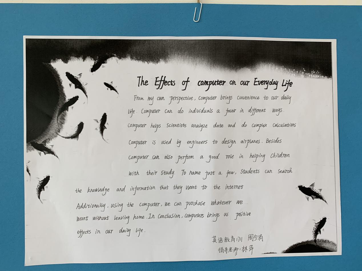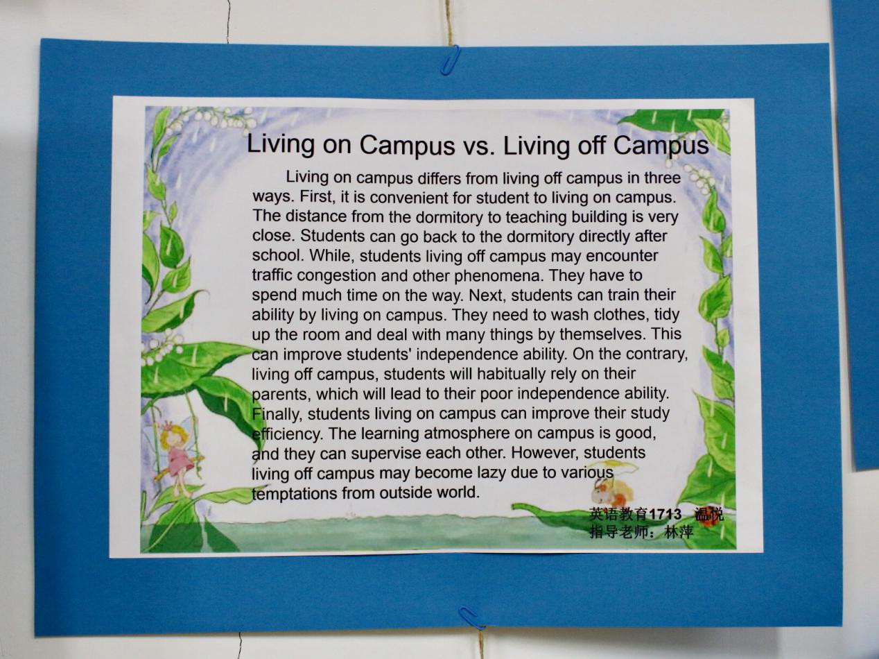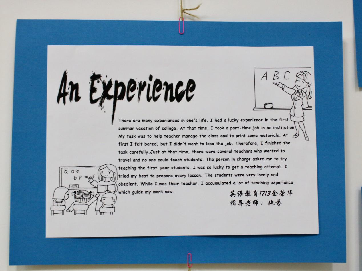 英语的四种基本技能分别是听、说、读、写,作为英语专业师范生,熟练掌握这些基本技能是成为明日之师的基础。通过这次习作展,不仅锻炼了同学们的写作能力,展示了自身的写作水平,而且为系部全体同学提供了一次很好的学习借鉴的机会。