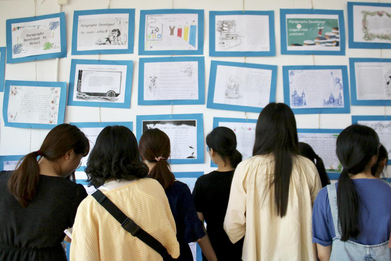 为了让学生将英文写作的理论知识充分运用于写作实践,增强学生的英语写作积极性,直观地展示写作课程的教学效果,为学生们提供相互学习和借鉴的机会,提高学生的英语写作能力,外语系于2019年5月23日—28日在二号楼3楼情景实训室举办2017级英语写作教学成果展示活动,本次成果展示的主题为"主题性段落习作展"。
