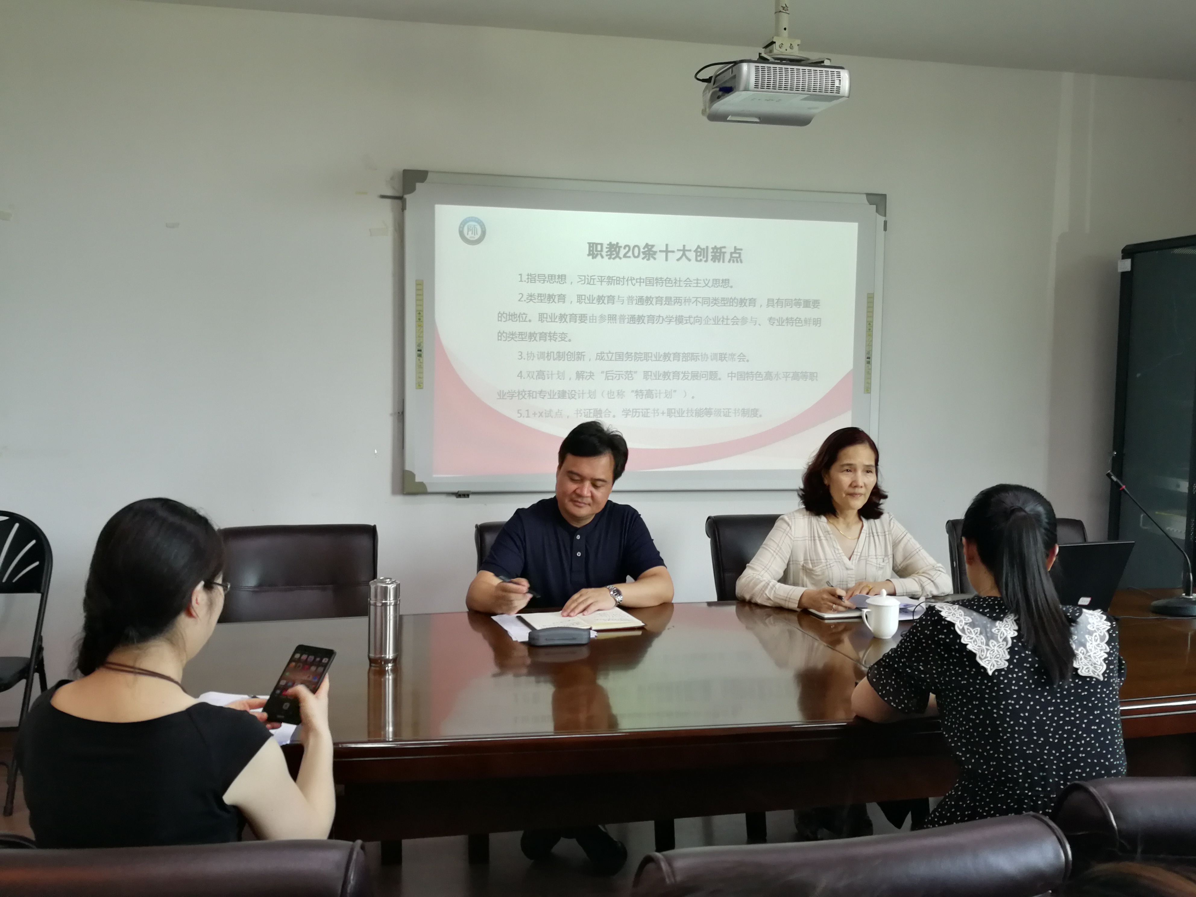会上,丁主任对《方案》进行了全文原汁原味解读,并对其中的"双高计划""1+x试点""产教融合"等陈锋校长整理出的"十大创新点"进行重点解读。
