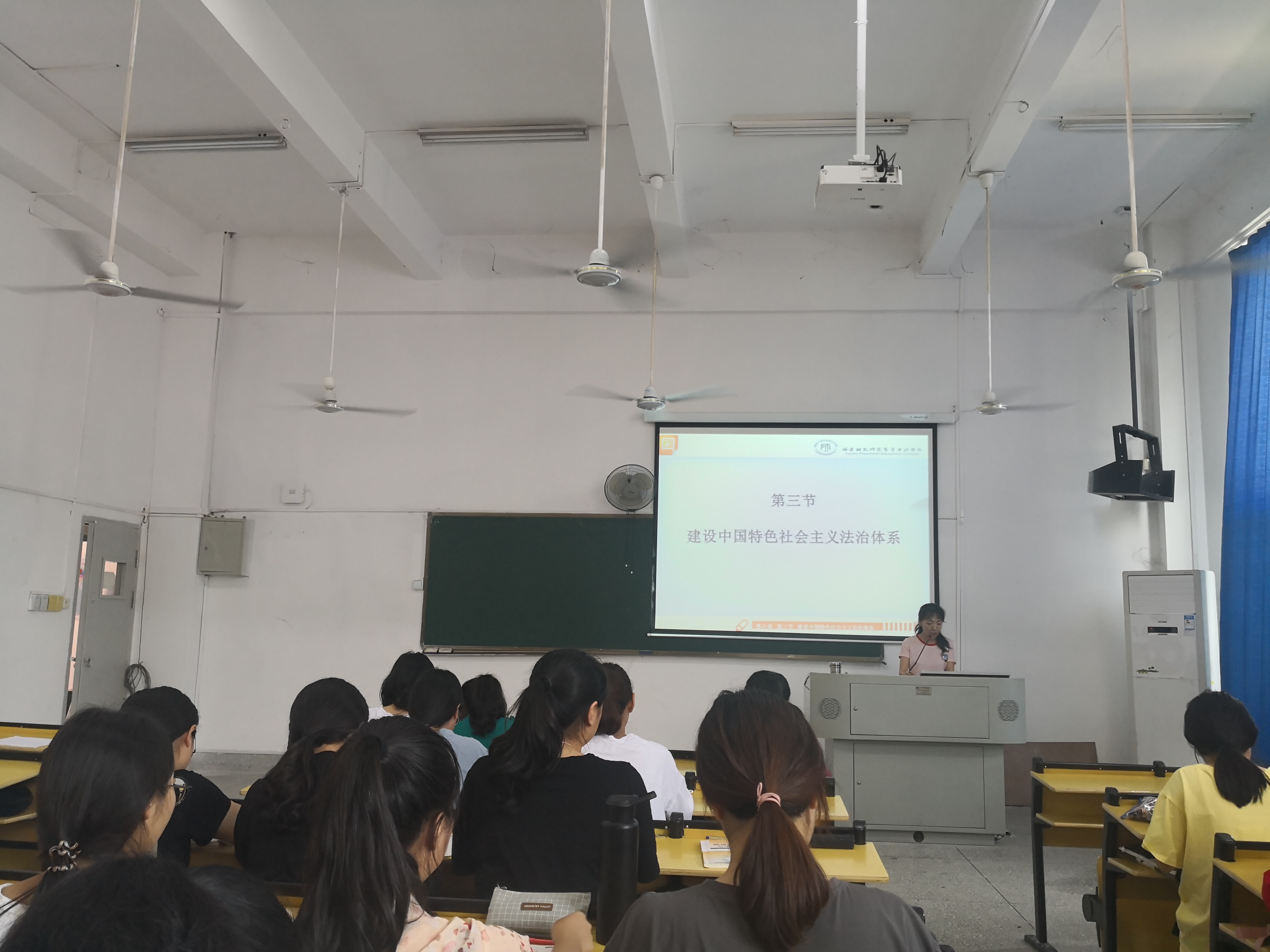 郑舒丹教师讲授章节为《中国特色社会主义法治体系》,她重点讲述了建设中国特色社会主义法治体系的主要内容以及全面依法治国的基本格局,运用大量素材和案例,结合法律热点话题,对如何提高立法质量,怎样科学立法、严格执法、公正司法、全民守法进行了别具一格的讲授,课堂上师生互动活跃,教学气氛融洽。