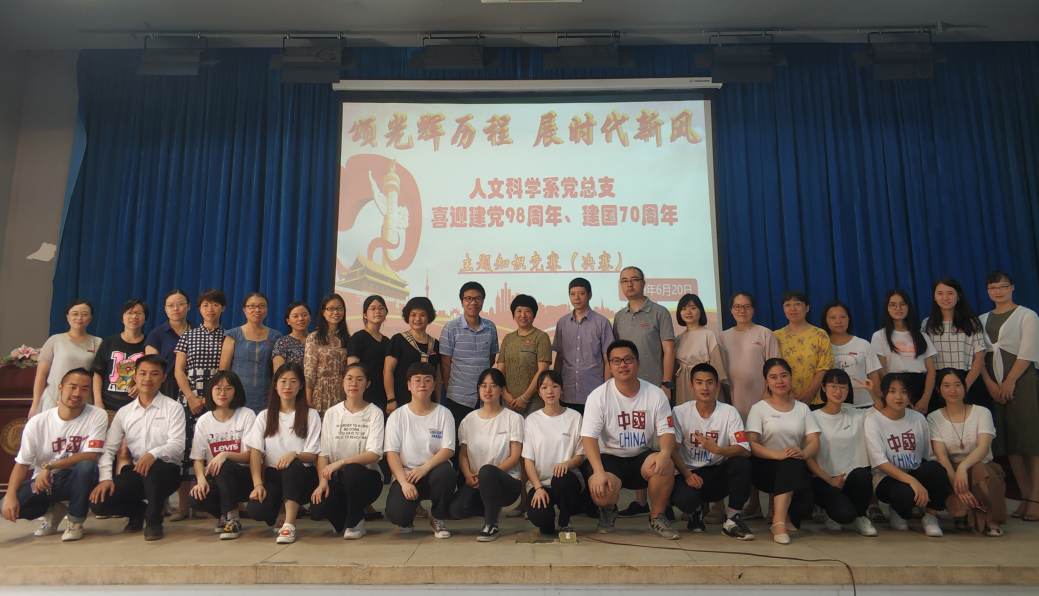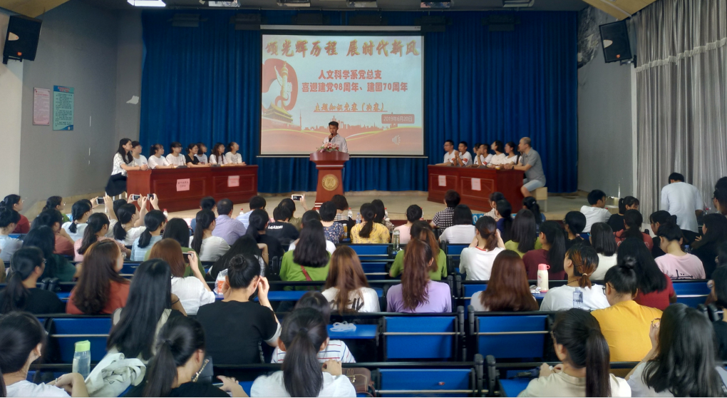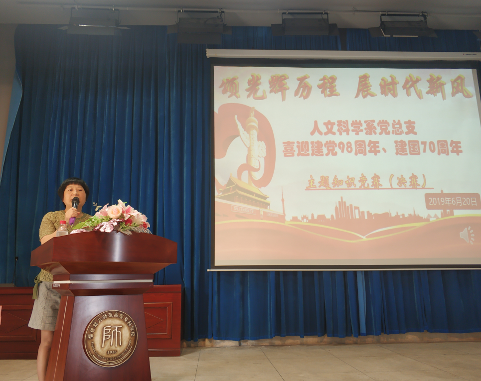 为迎接中国共产党建党九十八周年、新中国七十周年华诞的到来,回顾党和国家从诞生到发展到壮大的艰辛而光辉的历程,继承和发扬党的光荣传统,6月20日上午,人文科学系"颂光辉历程 展时代新风"——喜迎建党98周年、新中国成立70周年主题知识竞赛决赛在校图书馆学术报告厅举行。本次活动由人文科学系党总支主办,系学生第一党支部承办。人文科学系全体师生党员、积极分子参加了本次活动,活动邀请了校马克思主义学院的陈香珠副教授进行赛事指导。