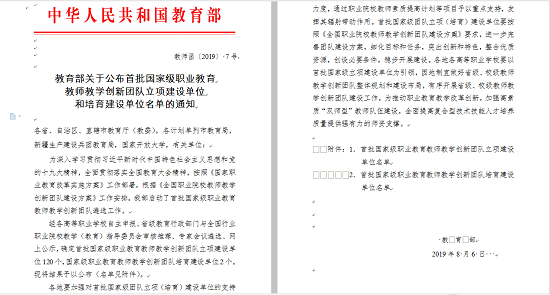 2019年8月,教育部教师工作司关于首批国家级职业教育教师教学创新团队遴选结果公示,在校领导班子的关心下,在陈峰校长亲自指导下,我校学前教育团队成功入选首批国家级职业教育教师教学创新团队立项建设单位。