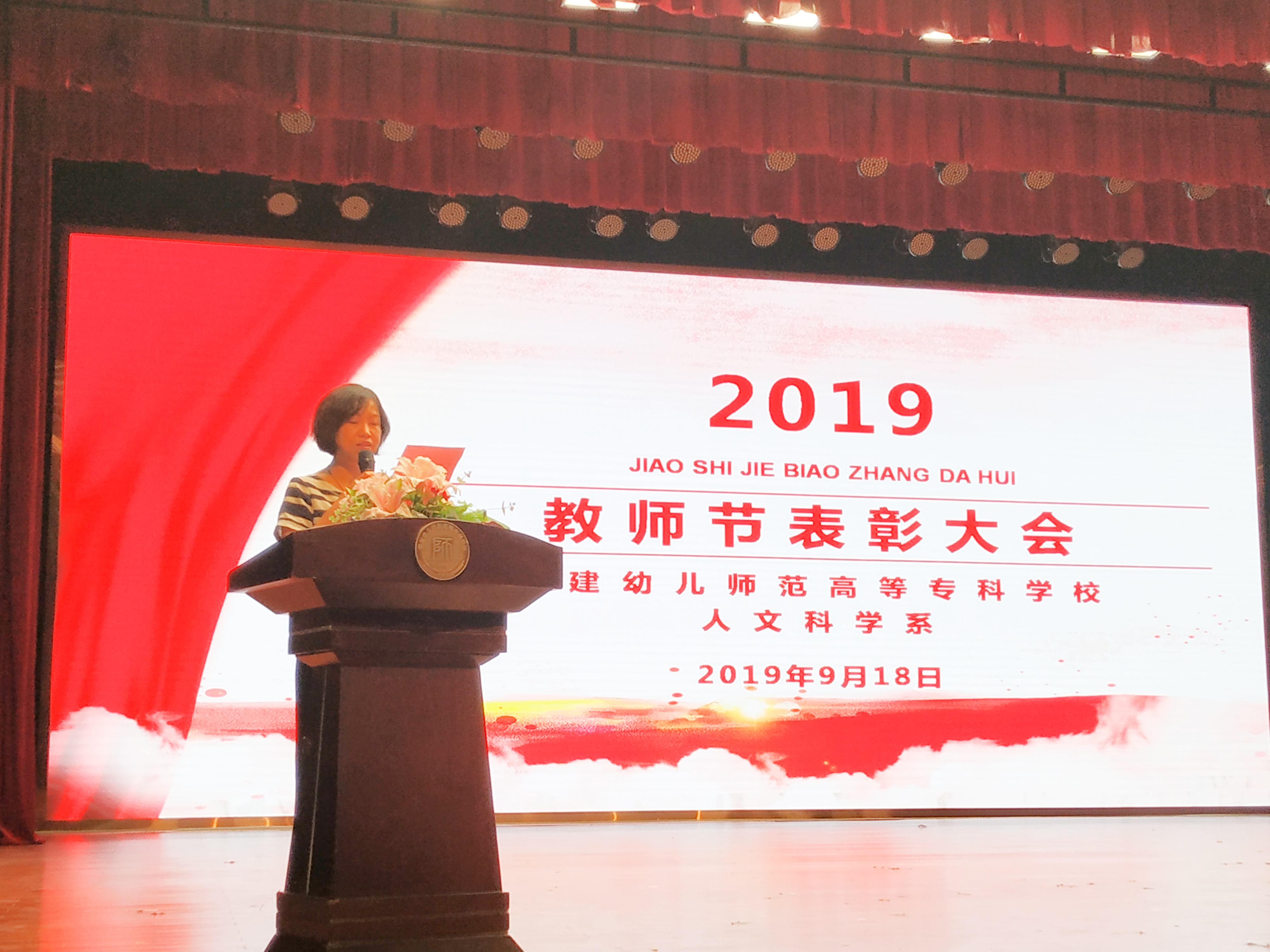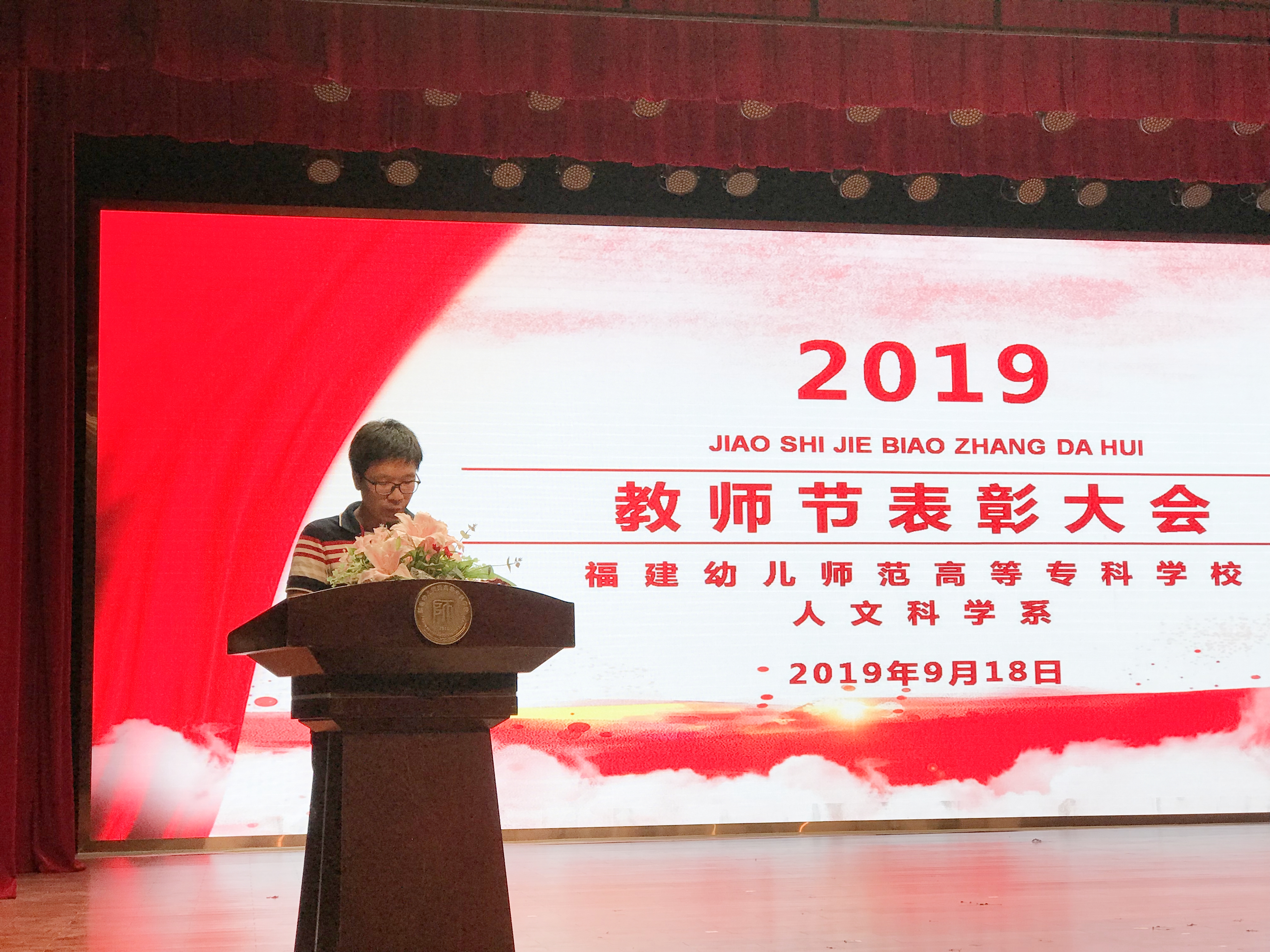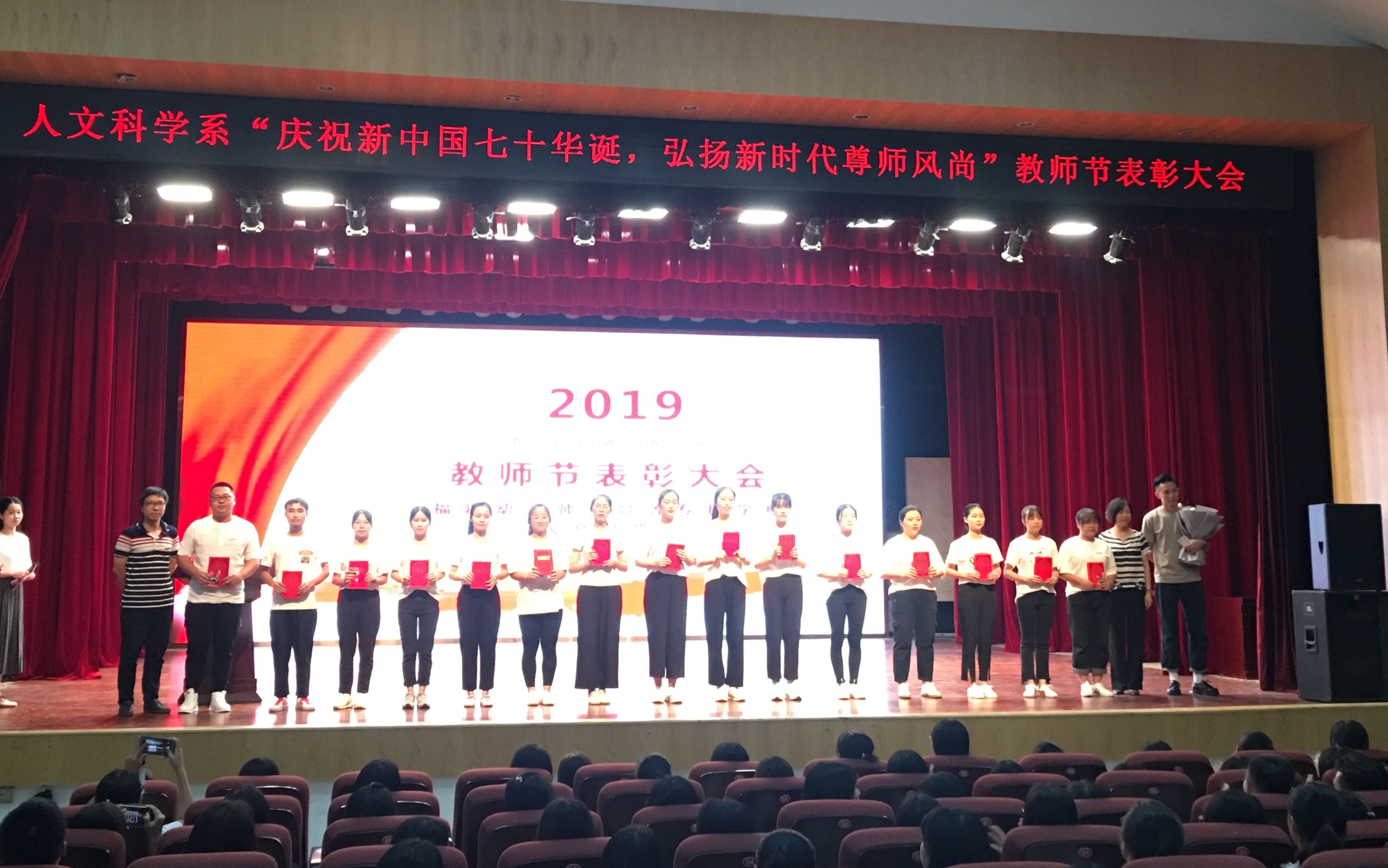 为了弘扬尊师重教、爱岗敬业、教书育人的精神,鼓励我系教师及师范生努力践行习近平总书记提出的"四有"好老师的要求,增强教师的荣誉感和责任感,9月18日晚,人文科学系在仓山校区礼堂隆重举行"庆祝新中国七十华诞,弘扬新时代尊师风尚"教师节表彰大会。校党委委员、副校长郑晓生,校党工部部长黄晖、校人事处处长陈凤玉、校培训中心主任薛少红、校图书馆馆长胥文玲、系党总支书记林琳、系主任姜平、系副主任刘建炜、系副书记周海林、系全体教师以及学生代表等500余人参加了大会。