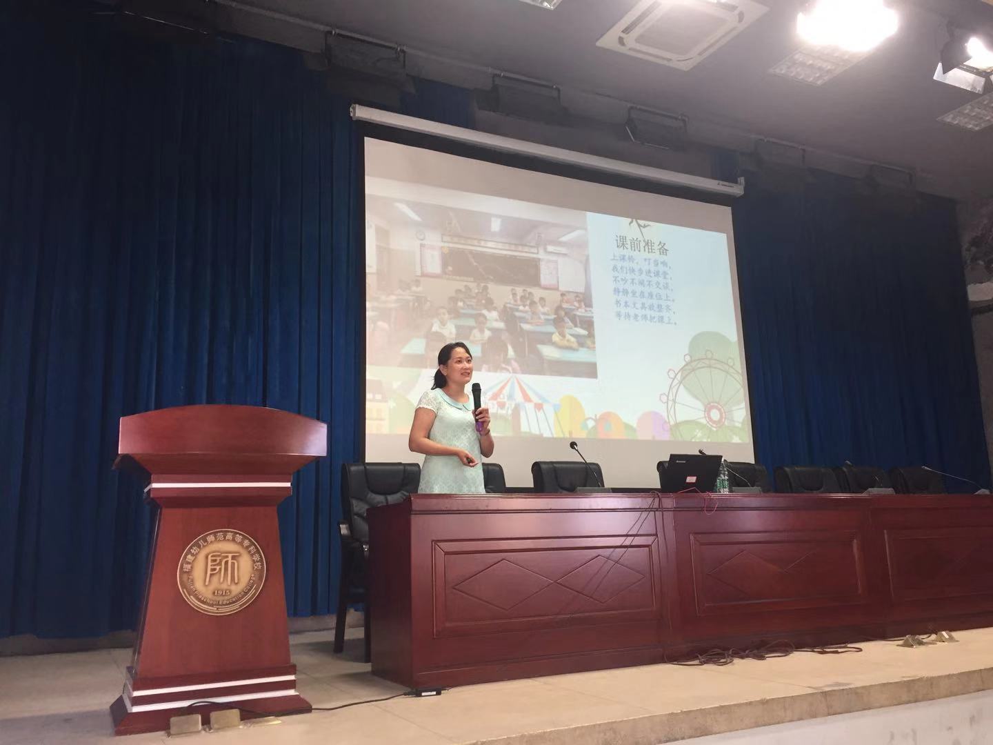 2019年9月23日下午,本学期我系"名师零距离"首场活动在校图书馆四楼正式拉开序幕!为提高17级师范生小学班主任工作实操能力,教育心理教研室邀请了福州教育学院附属第二中心小学唐禧老师开展了一场题为"小学班主任工作的智慧和艺术"的讲座,吴海燕老师、朱丹老师、王秀英老师及17级全体师范生聆听了讲座。