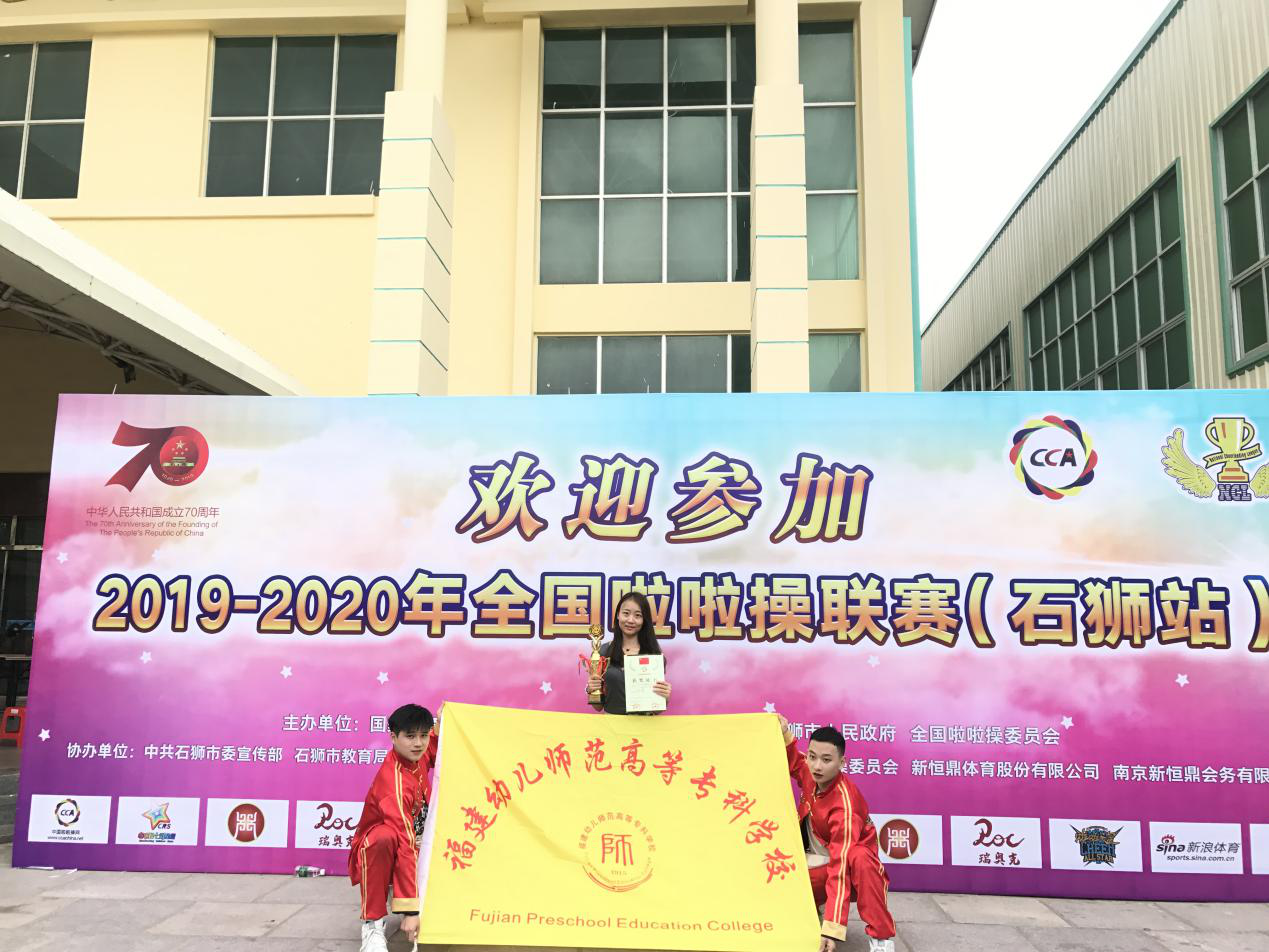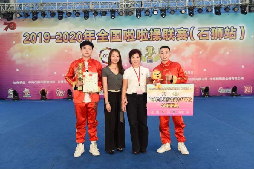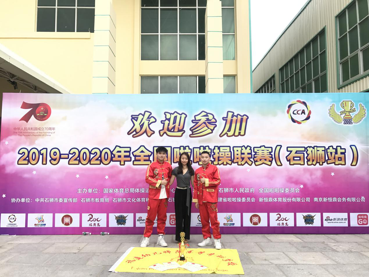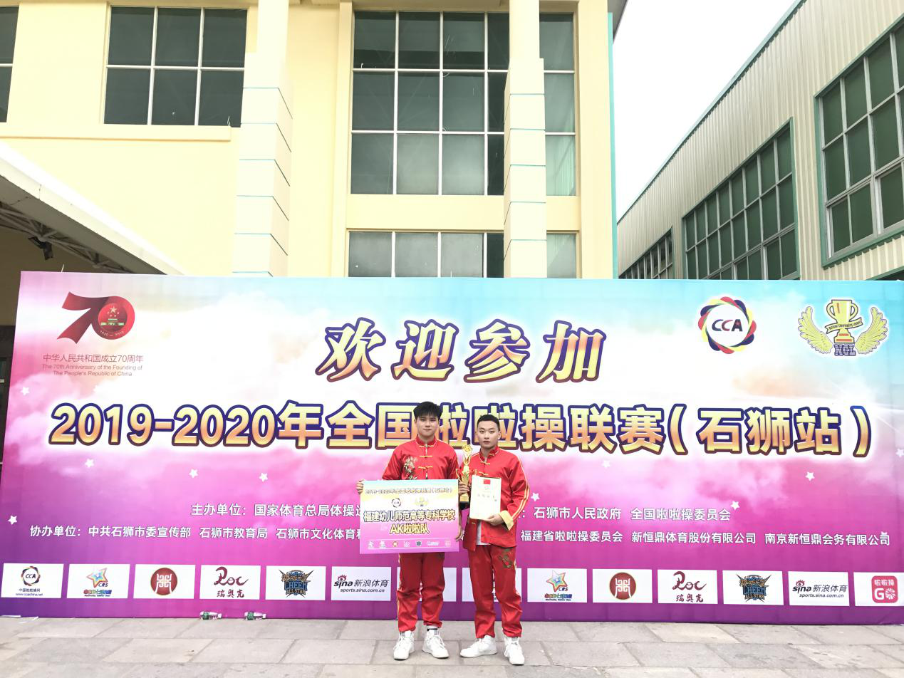 2019-2020年全国啦啦操联赛(石狮站)在10月7-10日在福建省石狮市举行!我校AK啦啦操队派出李夏胤、陈湘两位同学代表学校参赛,在指导教师谢琳焱的精心指导下,最终荣获本届青年丁组双人街舞冠军。