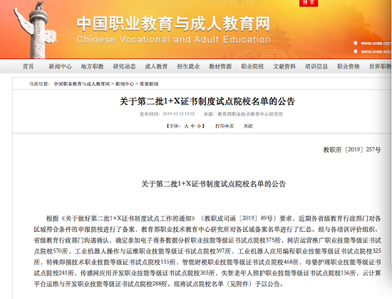 2019年10月12日,教育部职业技术教育中心研究所发布了《关于第二批"1+X"证书制度试点院校名单的公告》(教职所〔2019〕257号),在校领导的关心和指导下,我校成功入选教育部第二批母婴护理1证书制度试点院校。