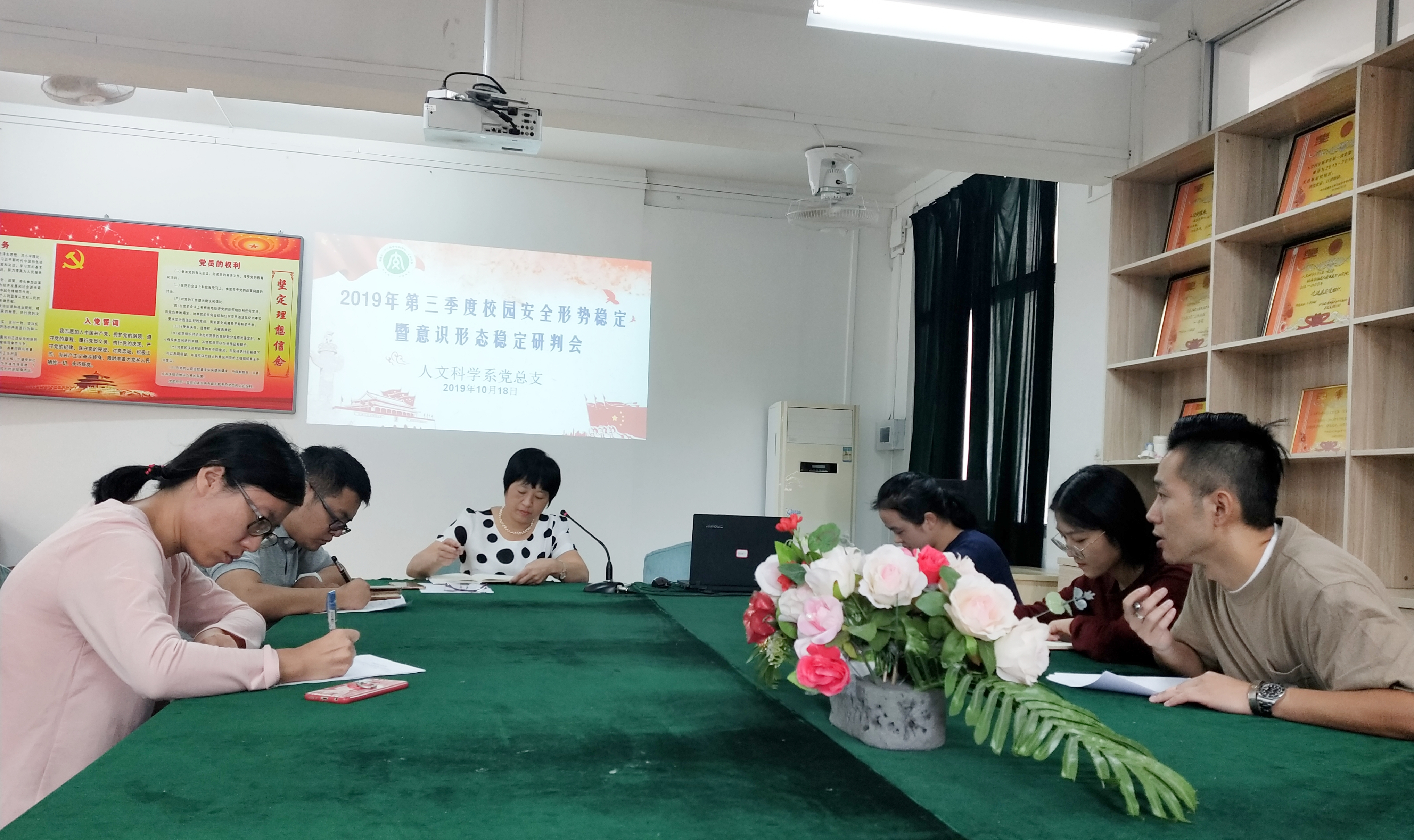 2019年10月18日上午,人文科学系召开2019年第三季度校园安全形势稳定暨意识形态稳定研判会。系党总支书记林琳和全体辅导员参加了会议,会议由林琳书记主持。