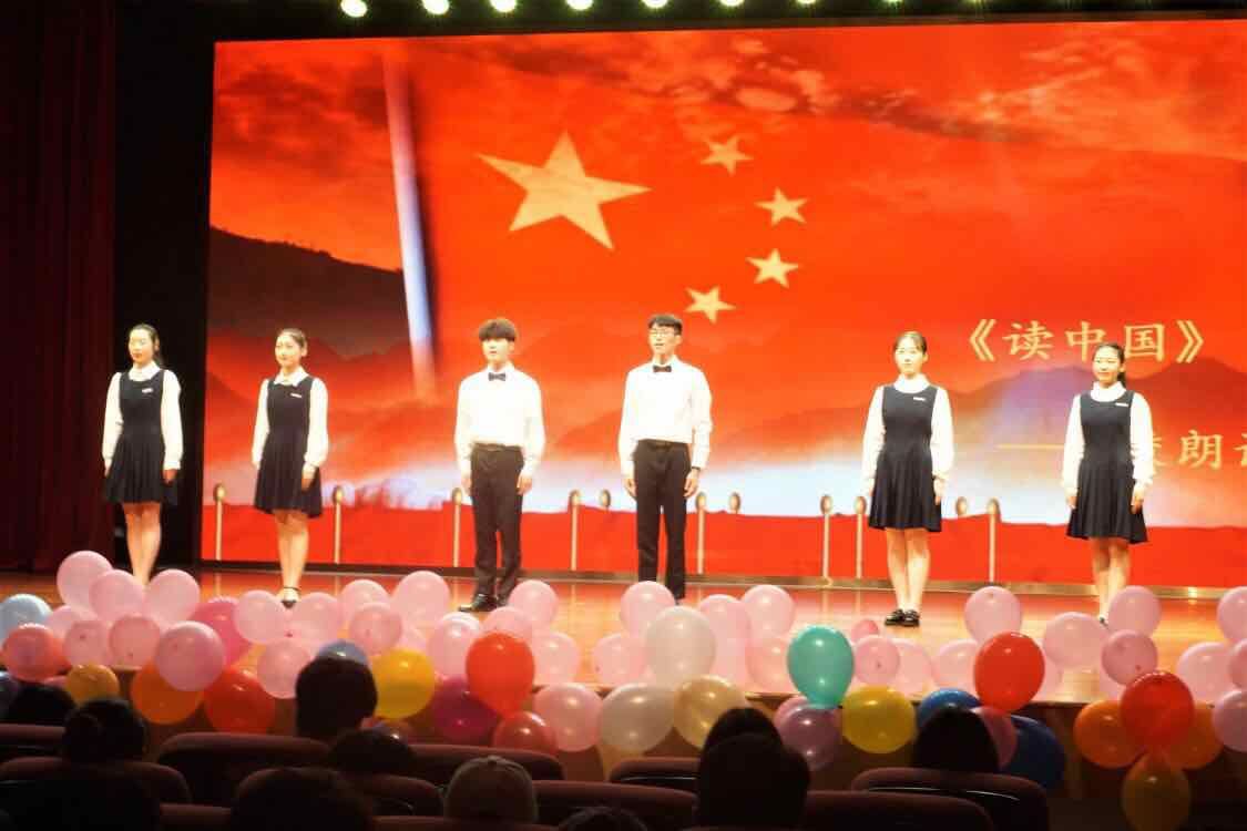 参赛的周菲、陈丽嫔、李君悦、胡钰雪、王智健、朱纪航等6位学生在陈朝霞、张玉玲老师的指导下,饱含激情演绎了诗歌《读中国》,献礼新中国成立七十周年,充分展示了我校在中华经典诵读教育教学中所取得的成效以及我校学生的专业素养。