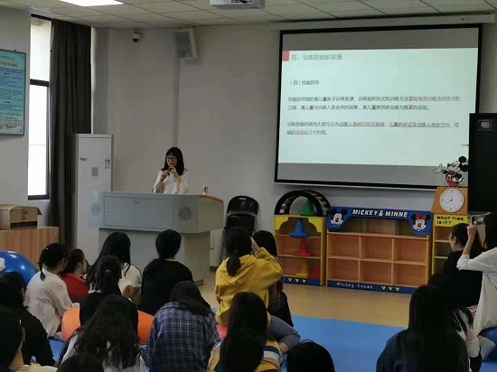 洪晓敏老师给特教1811的学生上的是《特殊儿童感觉统合训练》课程,教学过程中,洪晓敏老师结合自身的特殊教育实践经验,通过讲解、示范、练习等方法,帮助学生理解感统训练组织实施中的方法、要素及注意事项。课后,吴丽芳主任、叶圣军副处长与陈伙平教授深入交流了课堂教学情况,陈教授反馈,洪晓敏老师综合运用了多种方法,层层引导,很好的做到了实操教学中很重要的一点"讲练结合""以练为主",学生的反应热烈,师生互动融洽,教学效果好。