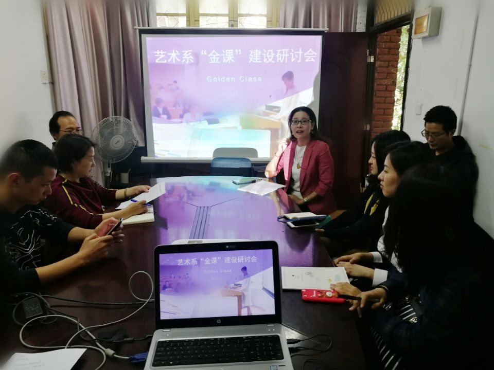 2019年11月5日,艺术系召开"金课"建设研讨会,组织申报"金课"评选活动的教师就"金课"建设情况进行研讨。会上,艺术系党总支书记、系主任王萍萍教授再次强调了"金课"建设的重要性,要求老师们要努力做有理想信念、有道德情操、有扎实学识、有仁爱之心的'四有'好老师",立德树人,弘扬新时代主旋律,体现"课程思政"的重要理念,充分运用现代化信息技术手段,进一步提高课程质量。