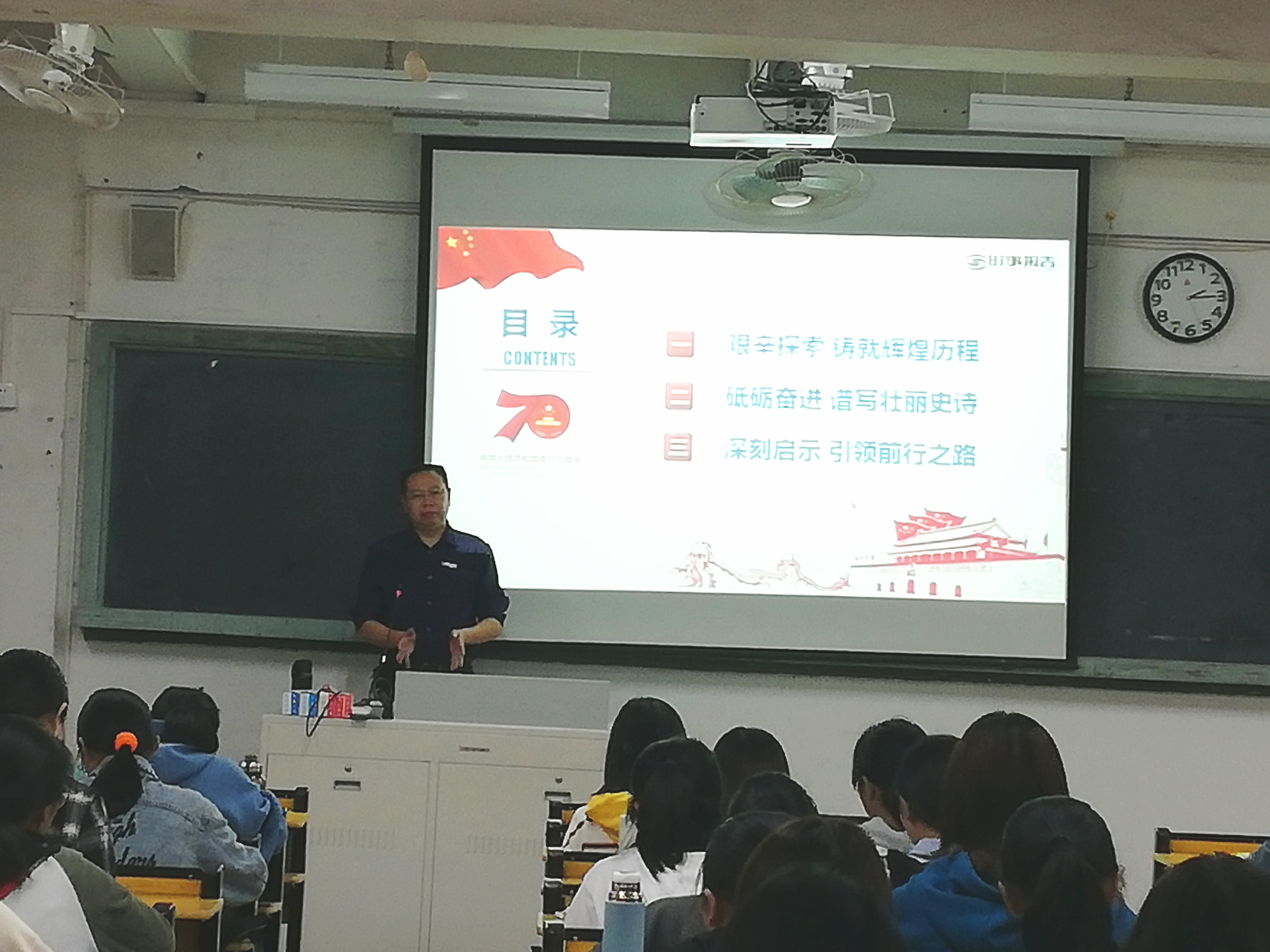 鲍书记以丰富的视频资料引导学生回顾新中国成立70周年来的伟大成就。他从"艰辛探索 铸就辉煌历程""砥砺奋进 谱写壮丽史诗""深刻启示 引领前行之路"三大方面,深入解读了中国共产党领导人民建设新中国的伟大历程,阐释了中国共产党为什么"能",马克思主义为什么"行",中国特色社会主义为什么"好"等重大问题。