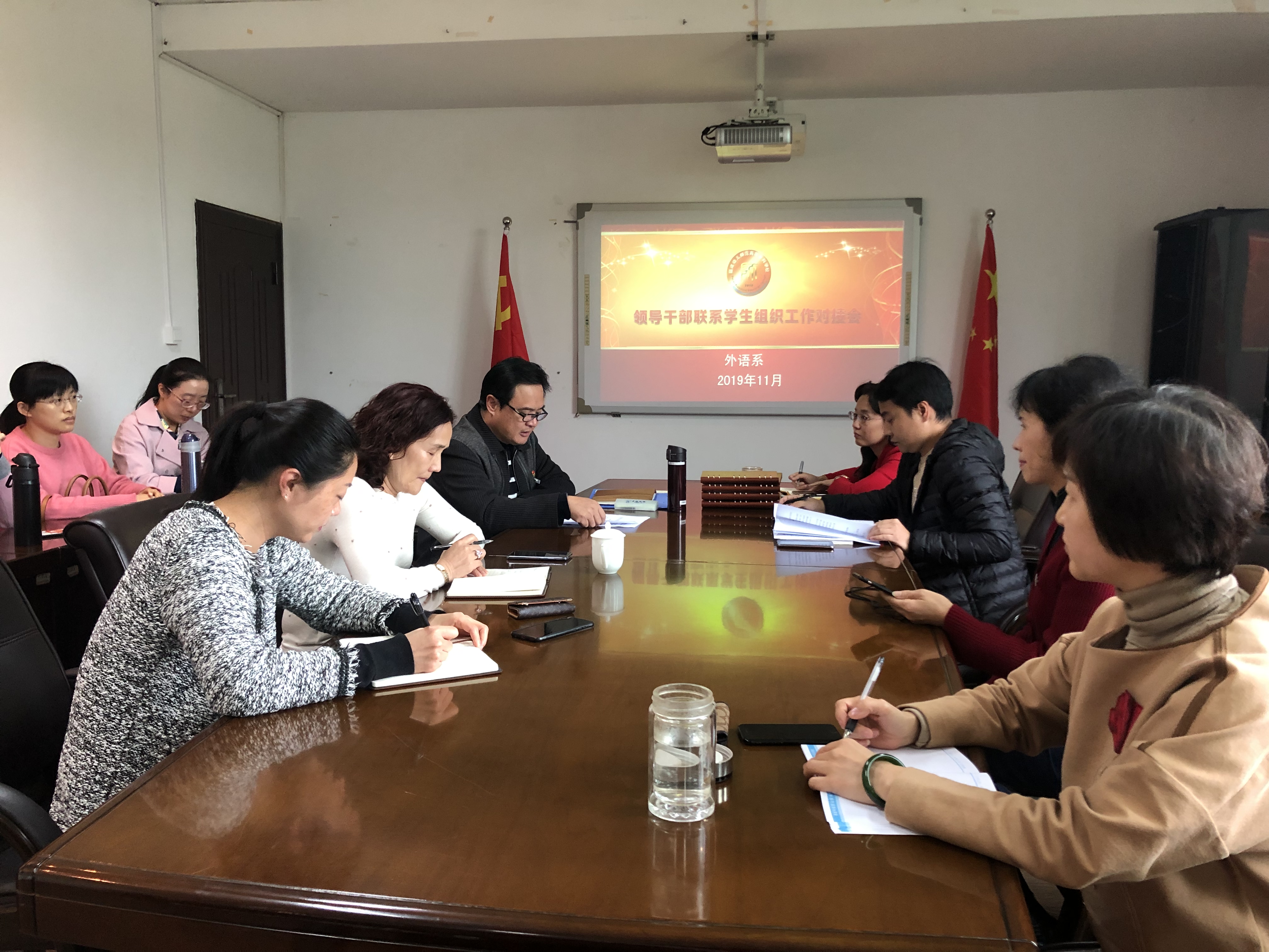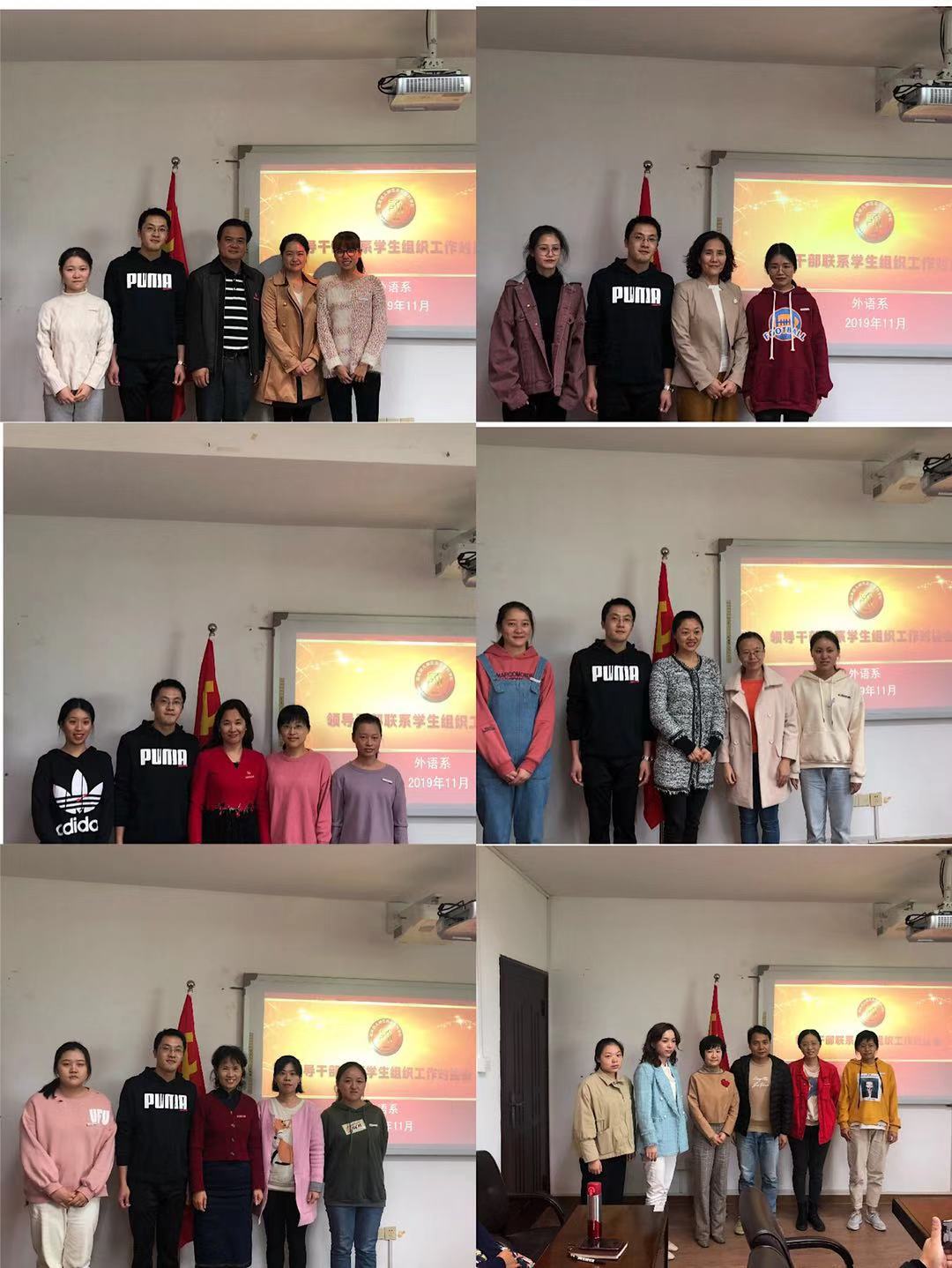 外语系党总支林祥昊书记首先宣读了《领导干部深入基层联系学生的工作方案》,传达本次工作要求:了解学生思想动态,引导学生成长成才,帮助学生解决困难,切实把思想政治工作做到学生的心坎上,增强大学生思想政治教育工作的针对性实效性,建设"全员育人、全程育人、全方位育人"一体化育人体系,促进学校以人才培养为中心的各项工作健康持续快速发展,形成长效机制。接着,外语系党总支胡华荣副书记公布了各班联系人、联系班级名单,各领导干部、老师和联系学生班级结成联络关系网,对所联系班级了解情况进行深入研究,方便今后与学生能够更好的沟通交流。