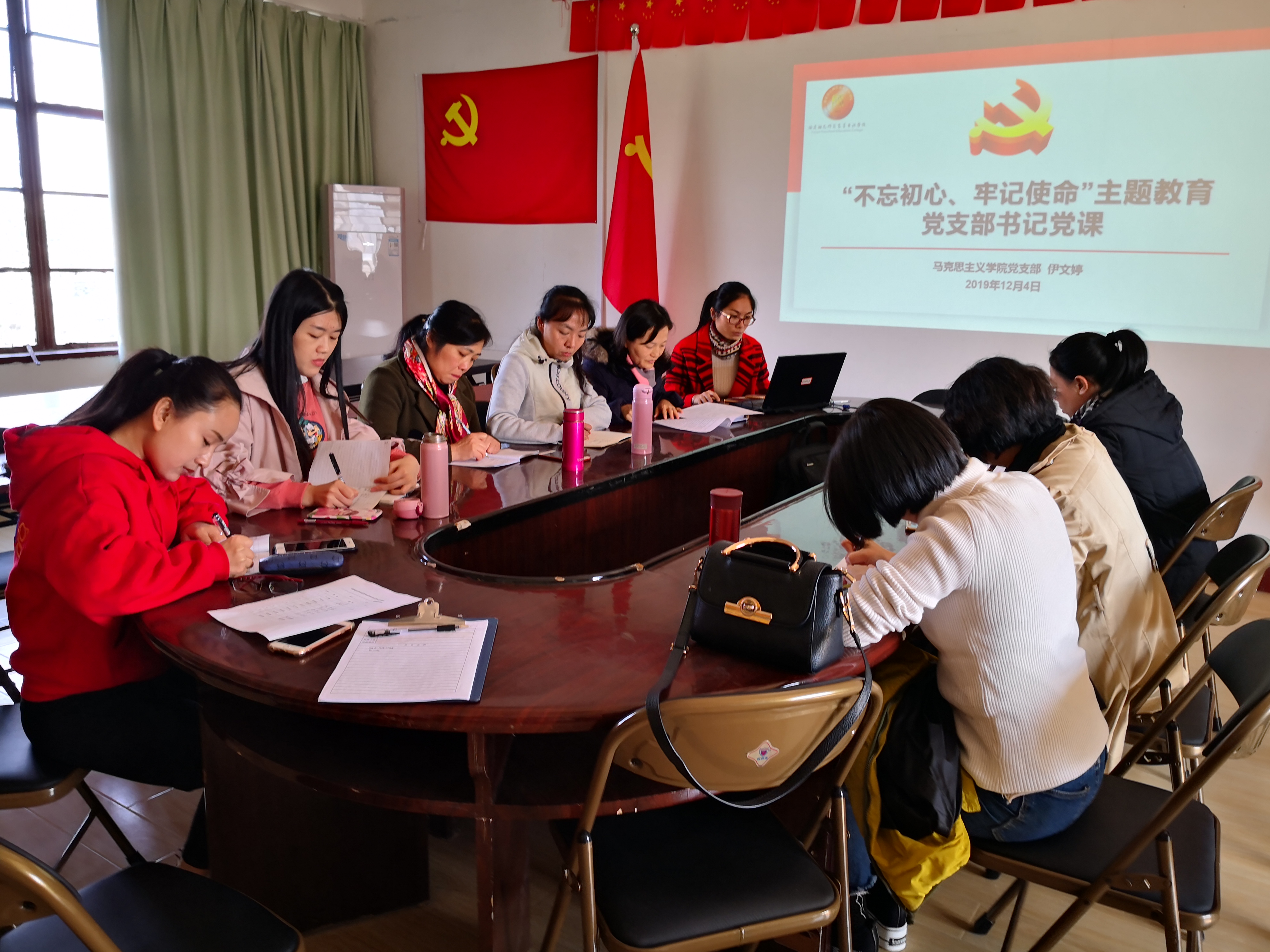 2019年11月29日,马克思主义学院组织全体教师于系办601会议室,开展"不忘初心、牢记使命"主题教育党支部书记党课。此次党课主讲人为马院党支部书记伊文婷教授。