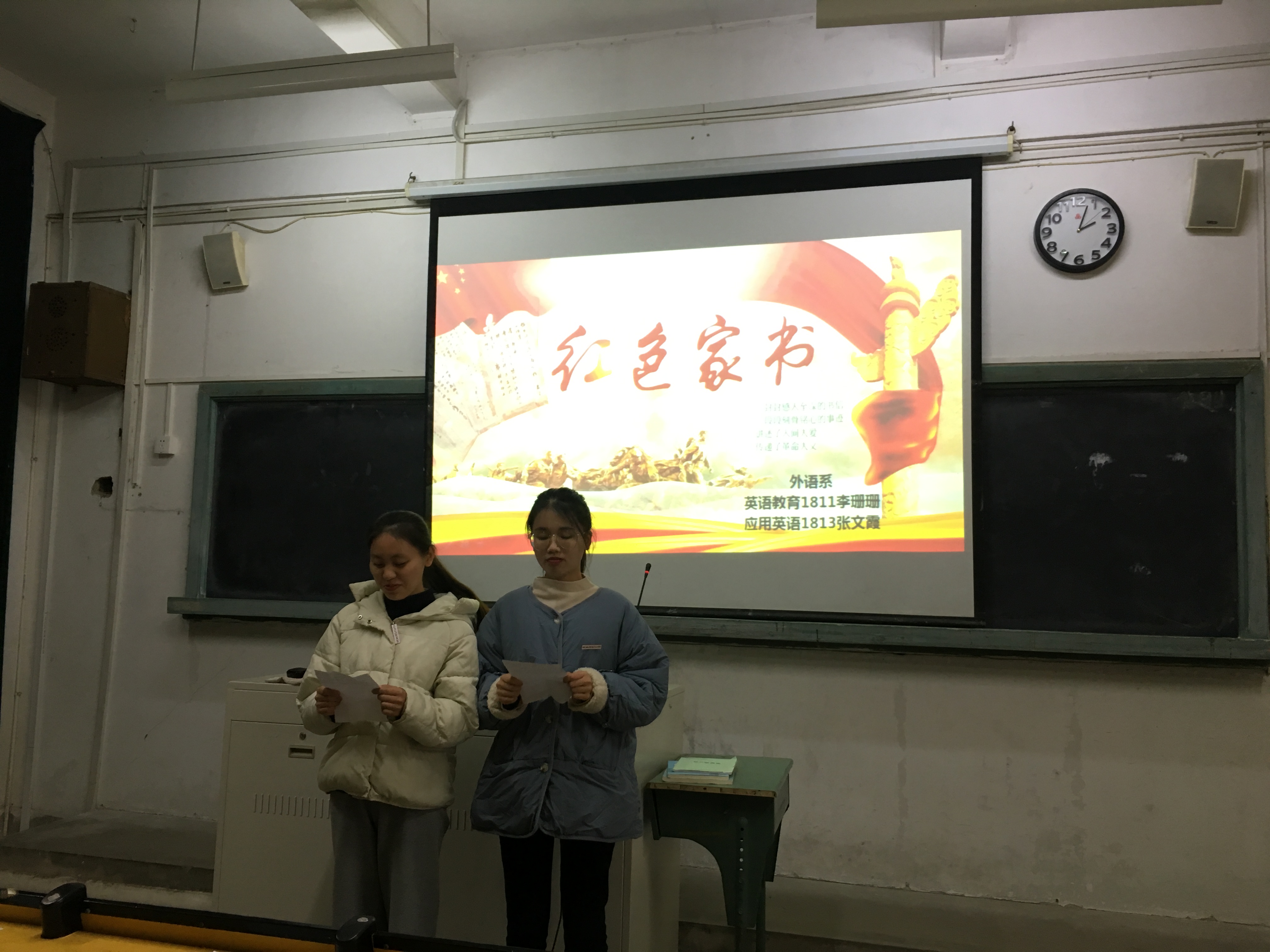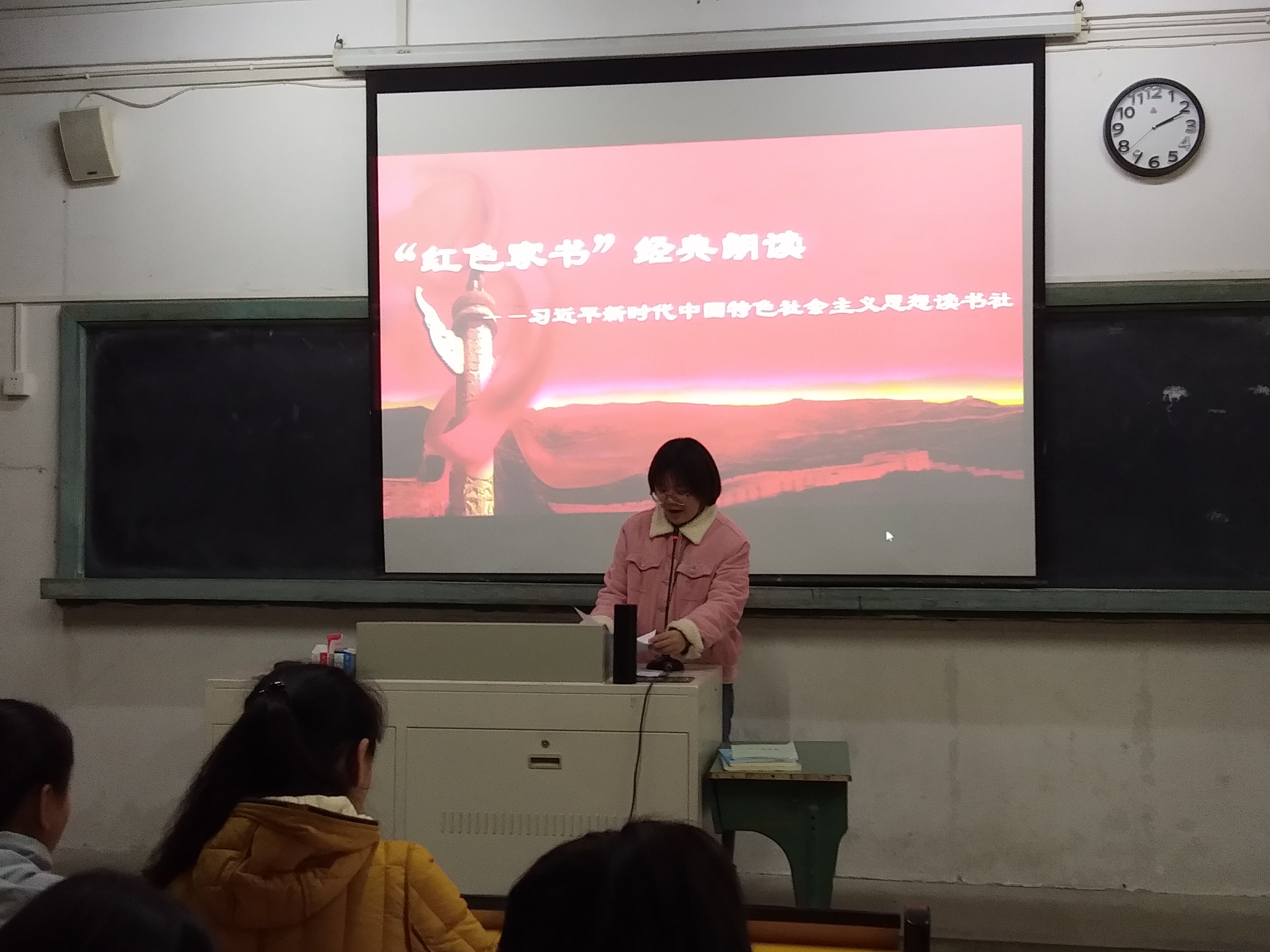 为贯彻落实党的十九大精神,重温革命历史,缅怀革命先烈,传承红色基因。2019年12月6日下午,我校习近平新时代中国特色社会主义思想读书社在教学楼A105顺利开展了红色家书朗读活动。马克思主义学院郑舒丹老师、胡新蕾老师以及读书社全体成员参与了此次活动。