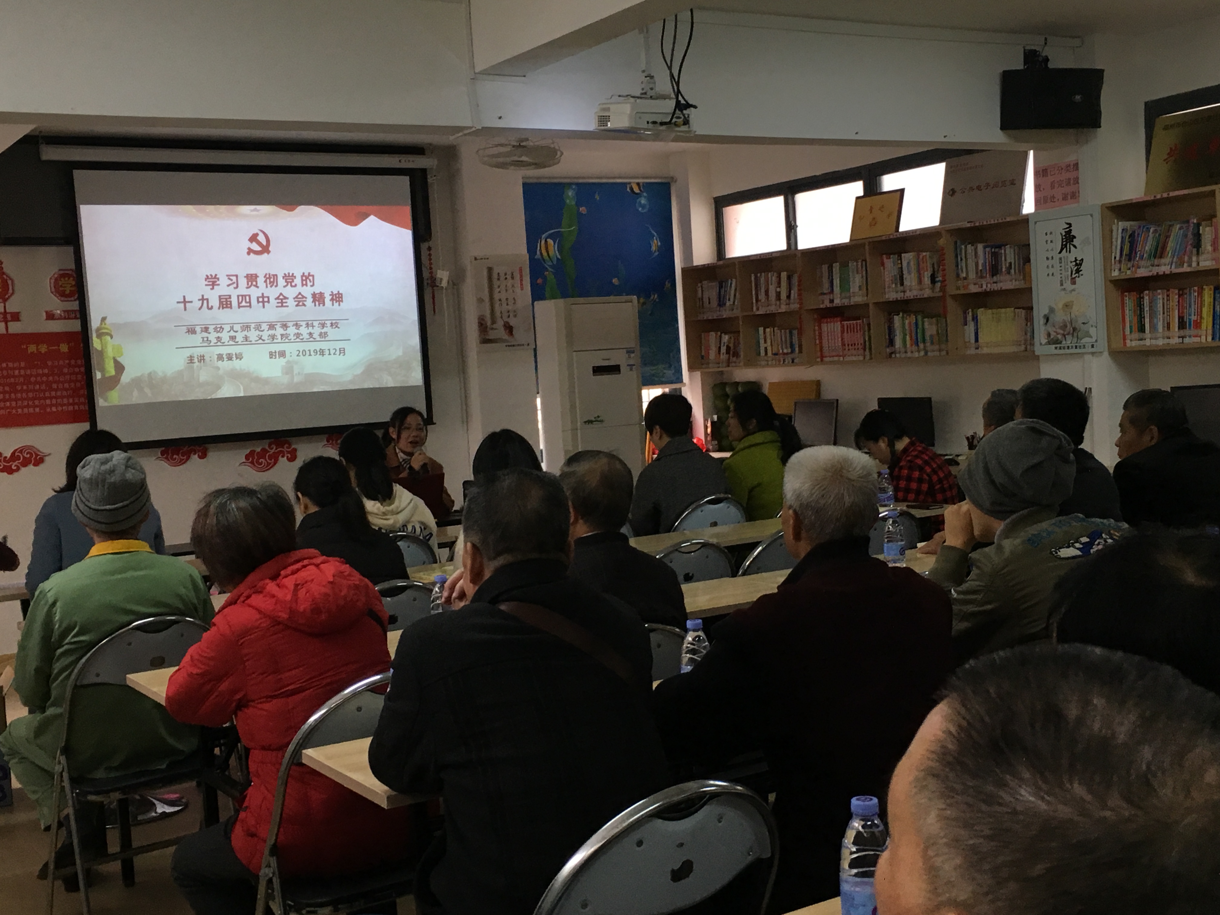 2019年12月10日上午,福州万里社区党支部学习贯彻党的十九届四中全会精神宣讲报告会在社区办公楼二楼举行。我院紧扣"不忘初心、牢记使命"主题教育,开展志愿服务活动,选派党员教师高雯婷赴万里社区党支部宣讲全会精神。