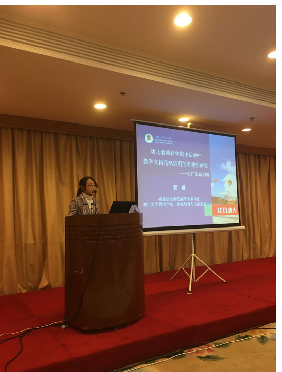 2019年12月19日-20日,第六届海峡两岸学前教育论坛在福建会堂隆重举行,来自海峡两岸、东南亚国家的学前教育界的专家、学者、幼儿园园长和福建省直相关单位领导共300余人参加论坛。我系教师、澳门大学教育学院在读博士管琳老师应邀在 "学前教育质量评价"分论坛做主题发言。管琳老师发言的题目是《幼儿教师科学集中活动中教学支持策略运用的有效性研究——以广东省为例》。她基于她到澳门大学幼儿教育与儿童发展中心读博士以来所参与的相关研究,对幼儿教师在科学教育活动中教学支持策略使用有效性及原因等研究成果进行了分享,为幼儿园教育活动质量评价提供了新的视角和方法,也为教师专业发展提出了相关建议。管琳老师的发言获得了与会者的肯定。