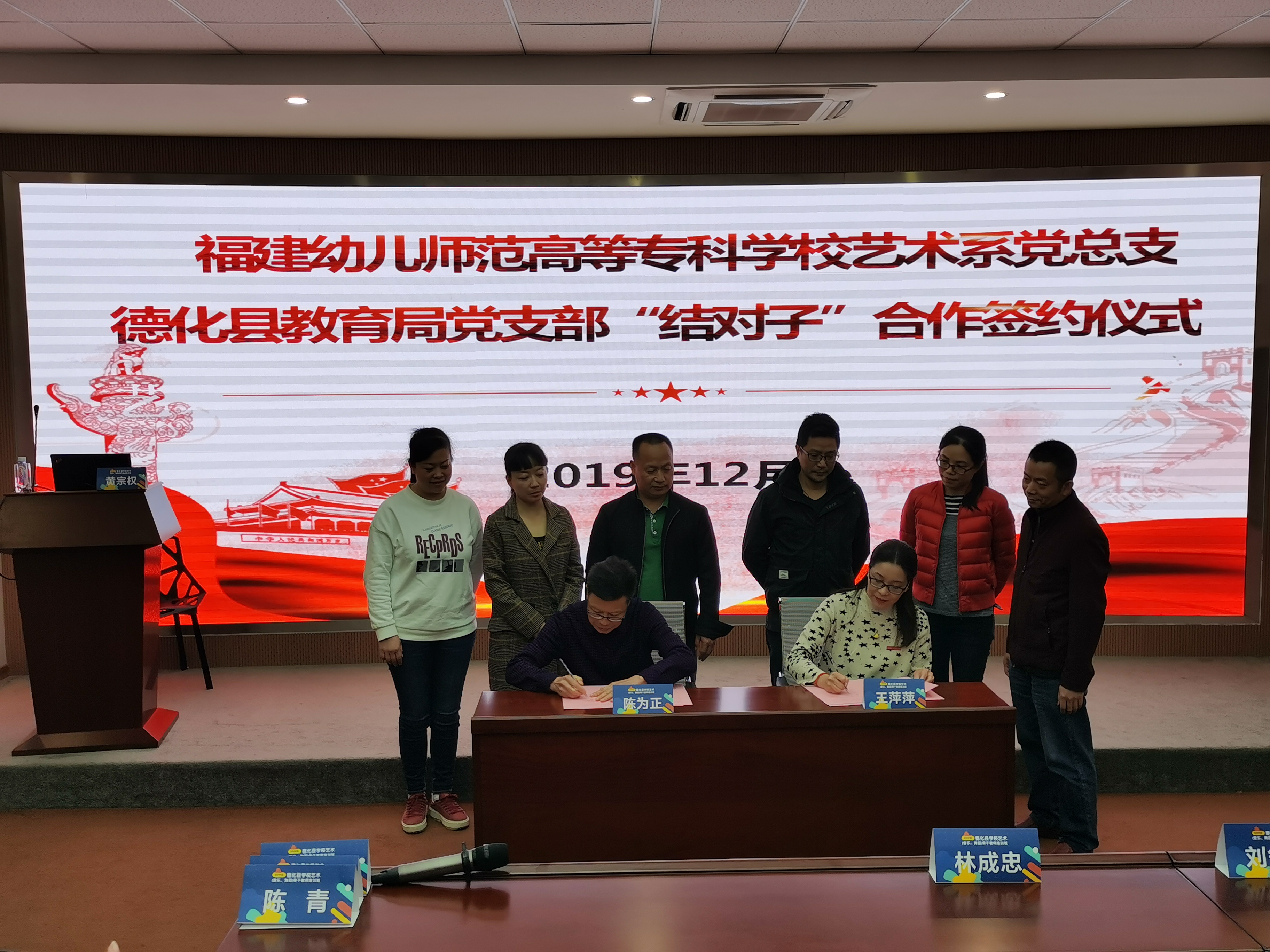 12月27日下午,艺术系党总支与德化县教育局党支部举行"结对子"合作签约仪式。艺术系党总支书记、主任王萍萍,党总支副书记刘舒敏、系副主任陈青等教师,以及德化县教育系统党委副书记陈为正、德化县教育局培训部主任陈能旺等教师参加签约仪式。签约仪式在校AR/VR中心举行,艺术系党总支书记、主任王萍萍,德化县教育系统党委副书记陈为正代表双方签署协议。