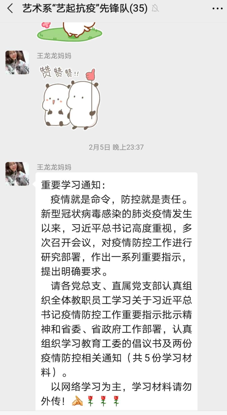 艺术系"艺起抗疫"先锋队队长王萍萍老师给各位党员们布置学习任务