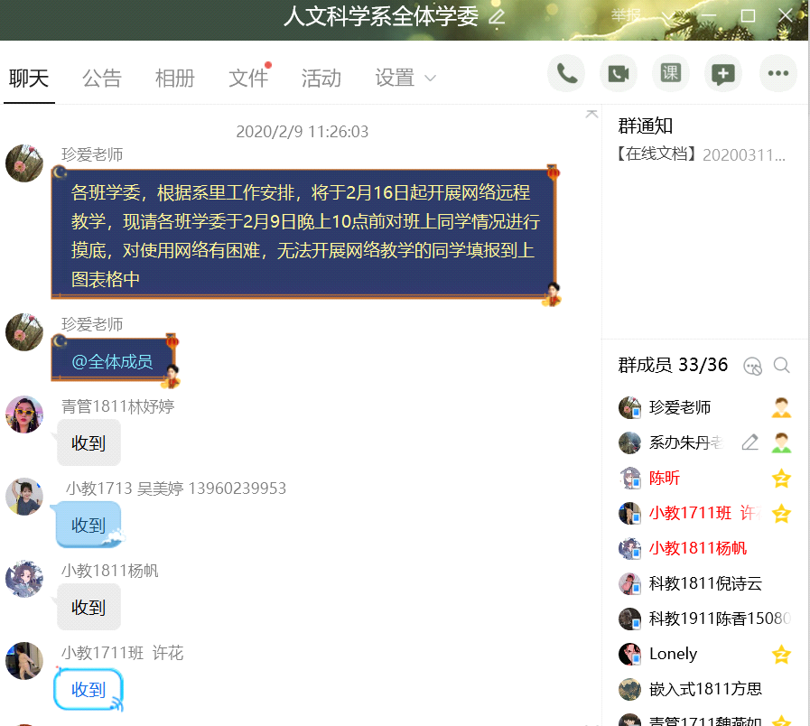 教学秘书林珍爱在疫情防控居家办公的特殊时期,努力平衡家庭与工作的关系,一边要承担照顾两个幼儿的家庭重担,一边依旧坚守岗位履职尽责,前期即对全系八个专业一千余名学生网络上课条件进行全方位的摸底调查,对无法参加线上学习的同学安排"一对一帮扶",确保每一个学生在"延学"阶段都能够"不停学",为后续顺利开展网课打下了坚实的基础。教学秘书朱丹同样身为幼孩的母亲,主动承揽任务,及时补台,与林珍爱老师配合默契。她及时对原有的课程安排进行调整,确认可开设线上教学的课程及教师名单,组织协调授课教师提前学习网上授课方式、上报课程授课方式;指导学生提前注册网络学习平台账号,对每一门开设课程的具体安排情况进行详细统计,帮助教师与所授班级学生建立联系。