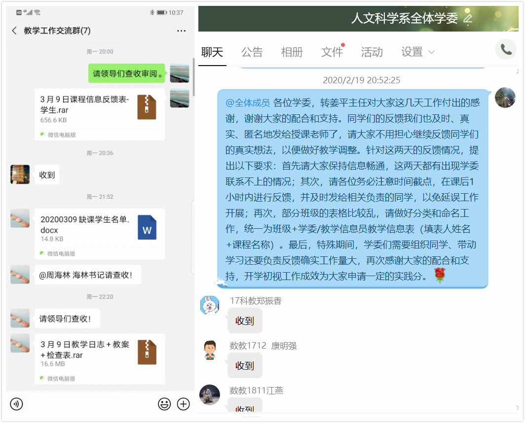 为保障线上教学质量,我系实施线上教学督导制,认真落实教学检查反馈工作,建立"人文系停课不停学"微信工作群,加强沟通交流,及时解决教师们线上教学的问题,以保证线上教学有序顺利进行。两位教学秘书积极协助系部做好教学常规检查工作,从教学信息员、学委、教师三方收集每门课程的教学情况反馈,了解教师、学生线上开课真实感受,坚持半天一查、每日一报,做到反馈及时有效,并为教师调整教学方法提供依据。林建晦、徐晋华两位党员老师担任系线上教学督导员,与系领导班子成员一起每周固定日排班开展教学督导工作。每日当班的教学督导员都认责地查看当日授课教师的教案、教学日志并了解教学反馈情况,对在线教学情况进行核查,并及时将相关情况反馈给专任教师,以便持续改进。在此基础上定期组织教研室主任召开教学反馈工作会议,研究解决线上教学存在的问题,进一步督促教师反思调整线上教学方式方法,通过问题分析解决与经验总结推广,不断提升教师的线上教学能力与教学质量。