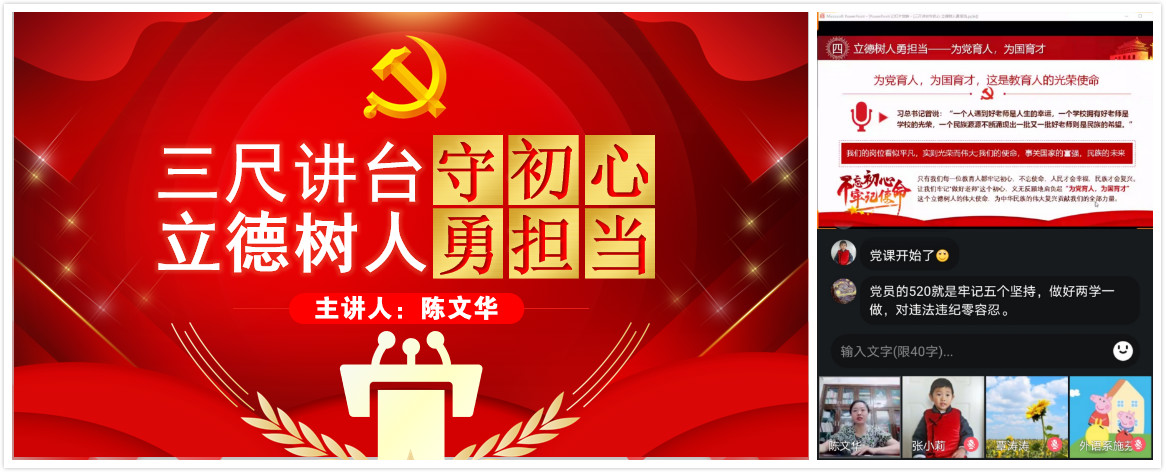 本次主题党日活动由支部副书记张小莉同志主持,支部党员教师参与。活动分为三个环节,首先,支部书记陈文华同志为党员教师上了主题为"三尺讲台守初心,立德树人勇担当"的云党课。云党课内容由坚定信仰与爱岗敬业两部分构成。第一部分,通过回顾党的历程,陈文华同志引导全体党员进一步坚定做一名讲政治、有信念的合格党员。第二部分,通过分享互联网平台上生动的案例,陈文华同志鼓励党员教师心存感恩,甘于奉献,坚持锐意进取,做到爱岗敬业。