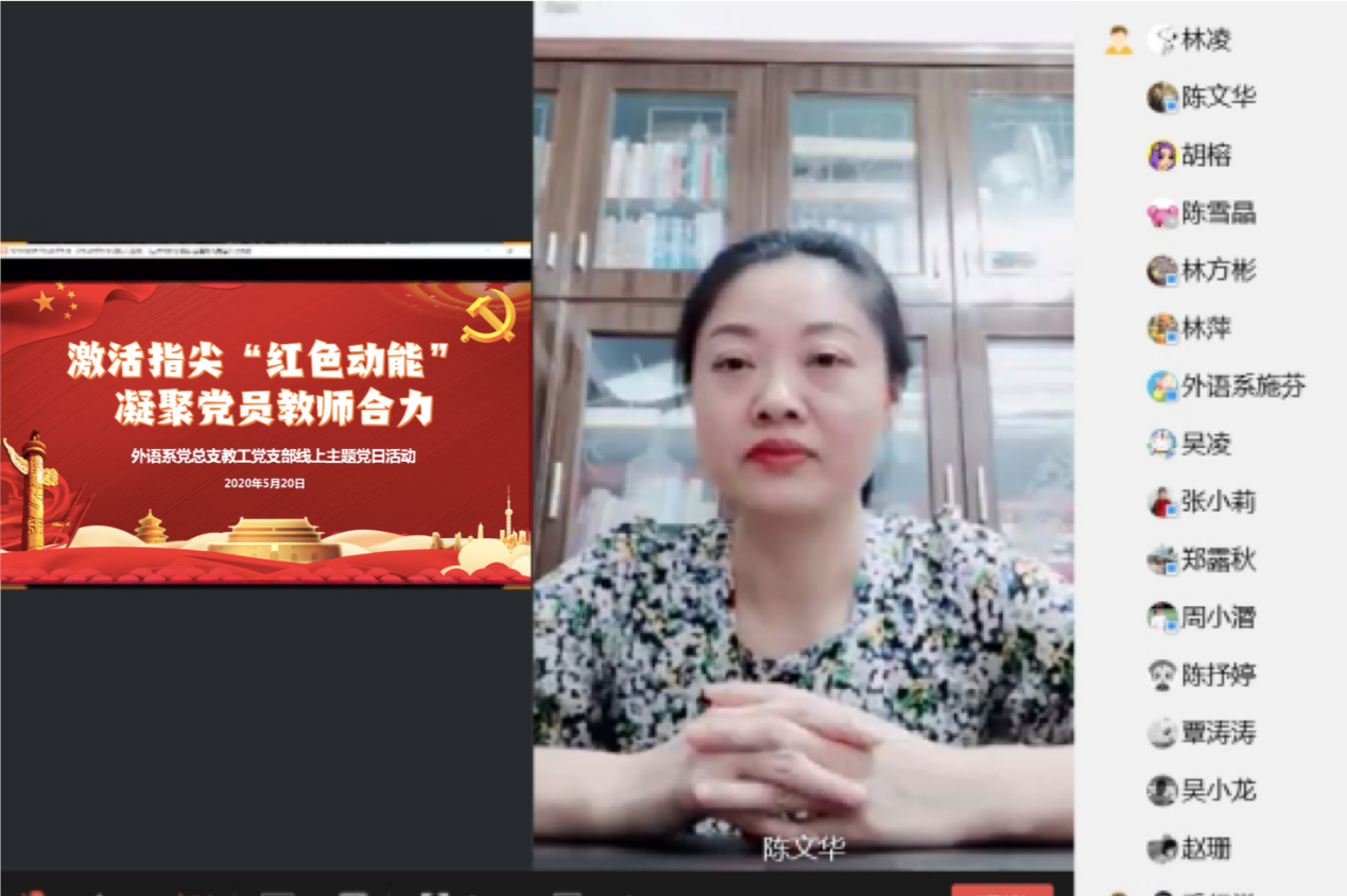 为落实立德树人的根本任务,全面提升教师思想政治素质和职业道德素养,激励全体党员教师爱岗敬业,外语系教工党支部在两会前夕,于5月20日晚7:30在外语系教工党支部工作群开展了主题为"激活指尖 '红色动能',凝聚党员教师合力"的线上党日活动。党员教师们一颗红心向我党,线上相聚一起学理论、表真情、探究与两会相关潮流热词,向党组织送上了最真诚的告白。