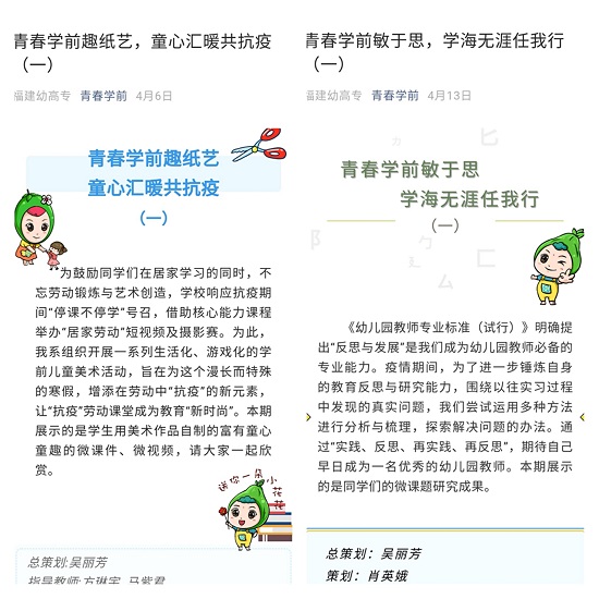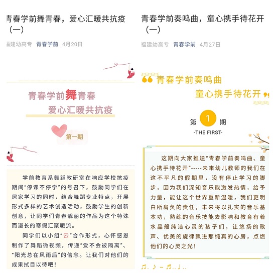 为满足特殊时期学生实习实训的需要,做到学生"停课不停学",从2020年2月中旬起,学前教育系结合教学进度,老师通过下发实训任务、视频资料,学生上交绘画、录音、视频等,开展丰富的线上实训活动,并创新形式,通过互联网举办师范生专业能力创新系列大赛。各教研室精心组织比赛,老师们利用线上平台开展远程指导答疑,对学生进行训练,并将比赛成果通过"青春学前"公众号进行推送展示,取得了良好的工作成效。