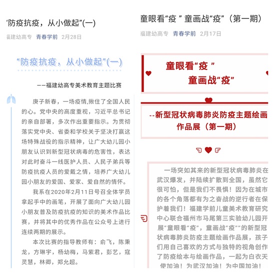 美术教研室教师发挥专业力量,组织开展生活化、游戏化的"青春学前趣纸艺,童心汇暖共抗疫"学前儿童美术比赛,学生们通过微视频、微课件展示一个个生动的抗疫美术作品,传播了正能量;舞蹈教研室组织开展"青春学前舞青春、爱心汇暖共抗疫"舞蹈大赛,鼓励学生在居家学习的同时,结合舞蹈专业特点开展形式多样的艺术创造,学生以小组"云"合作形式,心怀感恩制作了《如期到来的春天》《防疫小能手》等十条舞蹈微视频,传递"爱不会被隔离"、"阳光总在风雨后"的信念;音乐教研室组织开展"青春学前奏鸣曲、爱童心携手待花开"幼儿歌曲弹唱与表演唱比赛,学生以扎实的音乐基本功和音乐技法,创作了《防疫三字经》《郊游》等十余条音乐视频,用音乐激发热情,传递力量;教育组的相关教研室也面向我系4个专业不同年级的学生,开展"青春学前敏于思、学海无涯任我行"反思性教学案例征集比赛、"小手变魔术 师幼巧互动"手指游戏技能比赛和学前教育实践成长征文比赛等,充分利用抗疫宅家学习时间开展理论与实践并重的专业学习,有效提升学生的专业能力。
