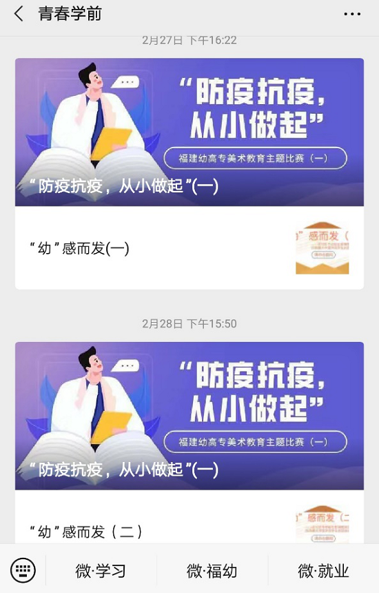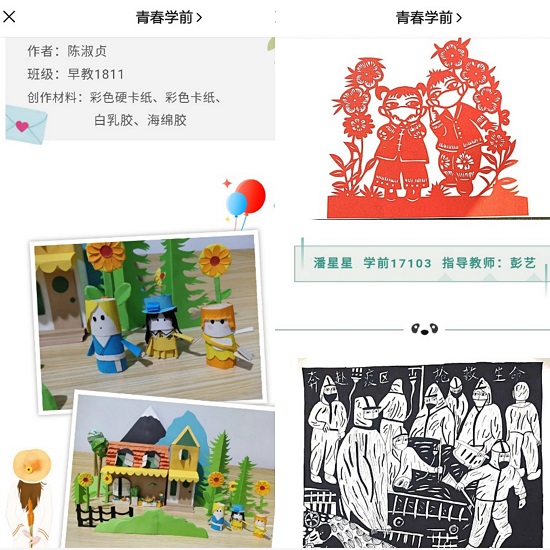 美术教研室教师根据美术学科特点,通过线上视频、线上答疑讨论、线上批阅作业、实时反馈讨论等方式引导学生开展《美术基础》《美术欣赏》《幼儿园实用手工与环境创设》等专业技能课程的学习,结合学前教育系现有的教学资源和学生学习的特点,通过微信群、QQ群、学习通等平台推送文字、图片、视频等多样化的学习资源,确保学生通过"眼观","耳听","手动",开展自主学习;进一步开展一系列线上活动"以赛促学""以展促学",前期开展了"学前教育系师范生教学能力创新大赛之"'防疫抗疫,从小做起'宣传教育主题美术作品比赛","青春学前趣纸艺,童心汇暖共抗疫"等活动,并通过学前微信公众号"青春学前"对优秀作品进行系列推送,近期主要通过网络平台针对毕业班学生进行线上毕业作品后期的调整、展示视频、作品呈现拍摄等方面的指导,后续还将开展"学前教育系2020届毕业生线上作品展示" 活动。