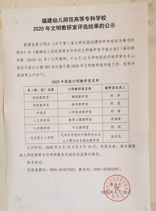 6月12日下午教务处在校办303会议室举办2020年文明教研室评选活动,全校共选出6个文明教研室,我系教育心理教研室获校2020年文明教研室。