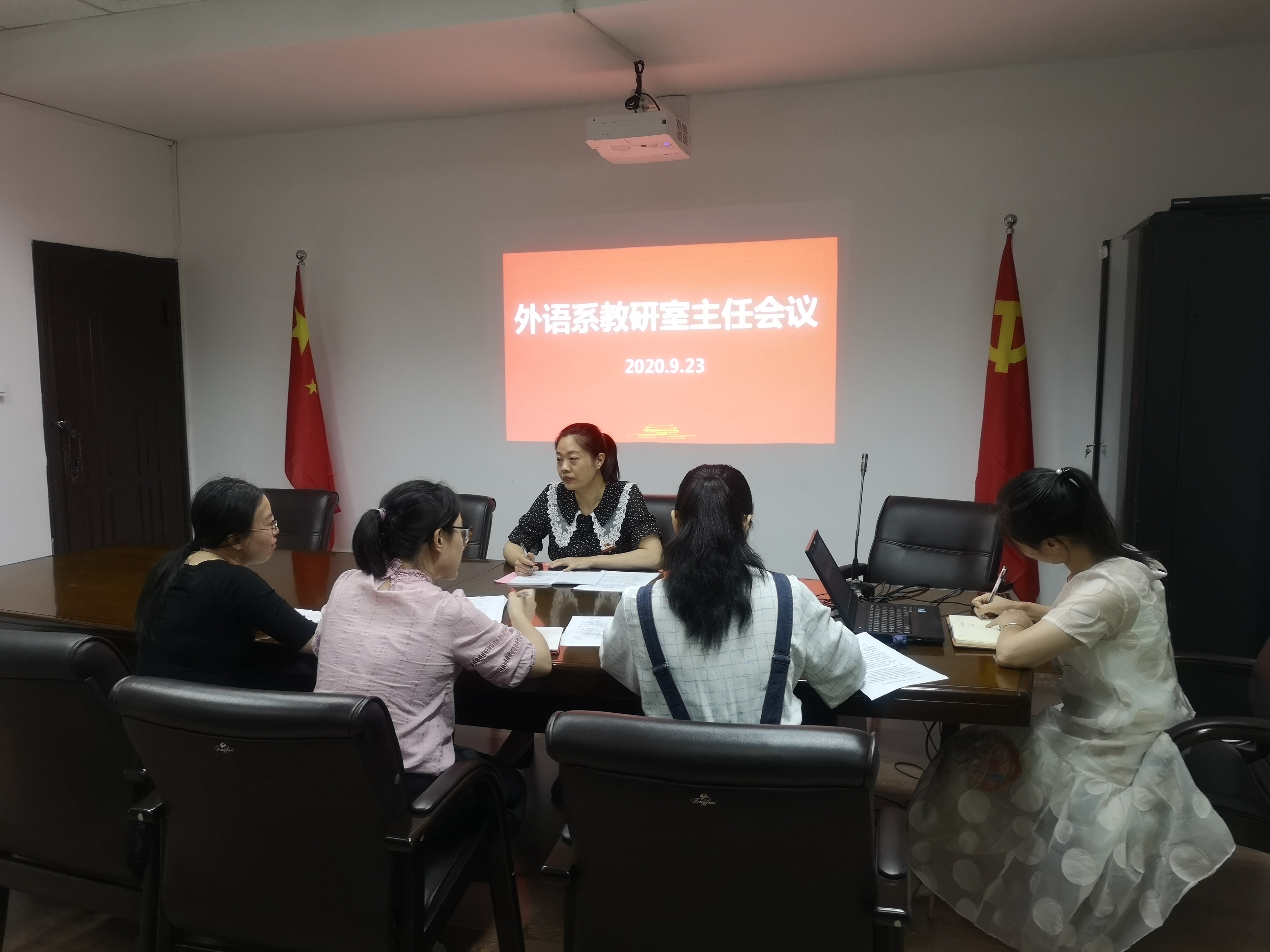 2020年9月23日下午,外语系陈文华副主任主持召开了教研室主任工作会议,陈雪晶、胡榕、席颖、张小莉等教研室主任参加了此次会议。
