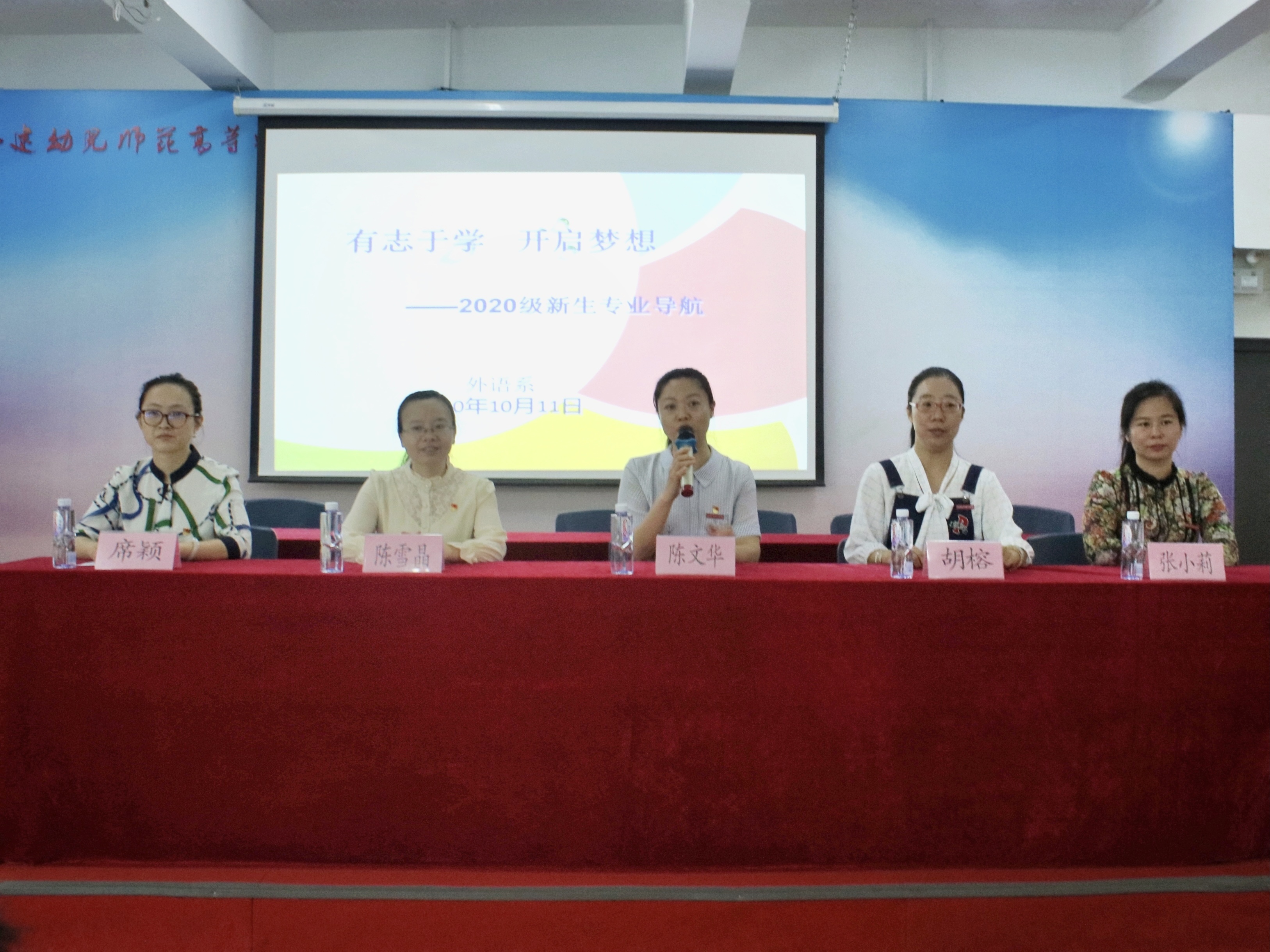 新生入学别慌忙,专业老师来导航。为了帮助新生更快明确专业目标,适应大学生活,2020年10月11日,我系在2号教学楼三层为全体2020级新生召开了一场主题为"有志于学 开启梦想"的专业导航系列讲座活动。外语系副主任陈文华、小学英语教研室主任胡榕、应用英语教研室主任陈雪晶、实训教研室主任席颖以及大学英语教研室主任张小莉参加本次活动。